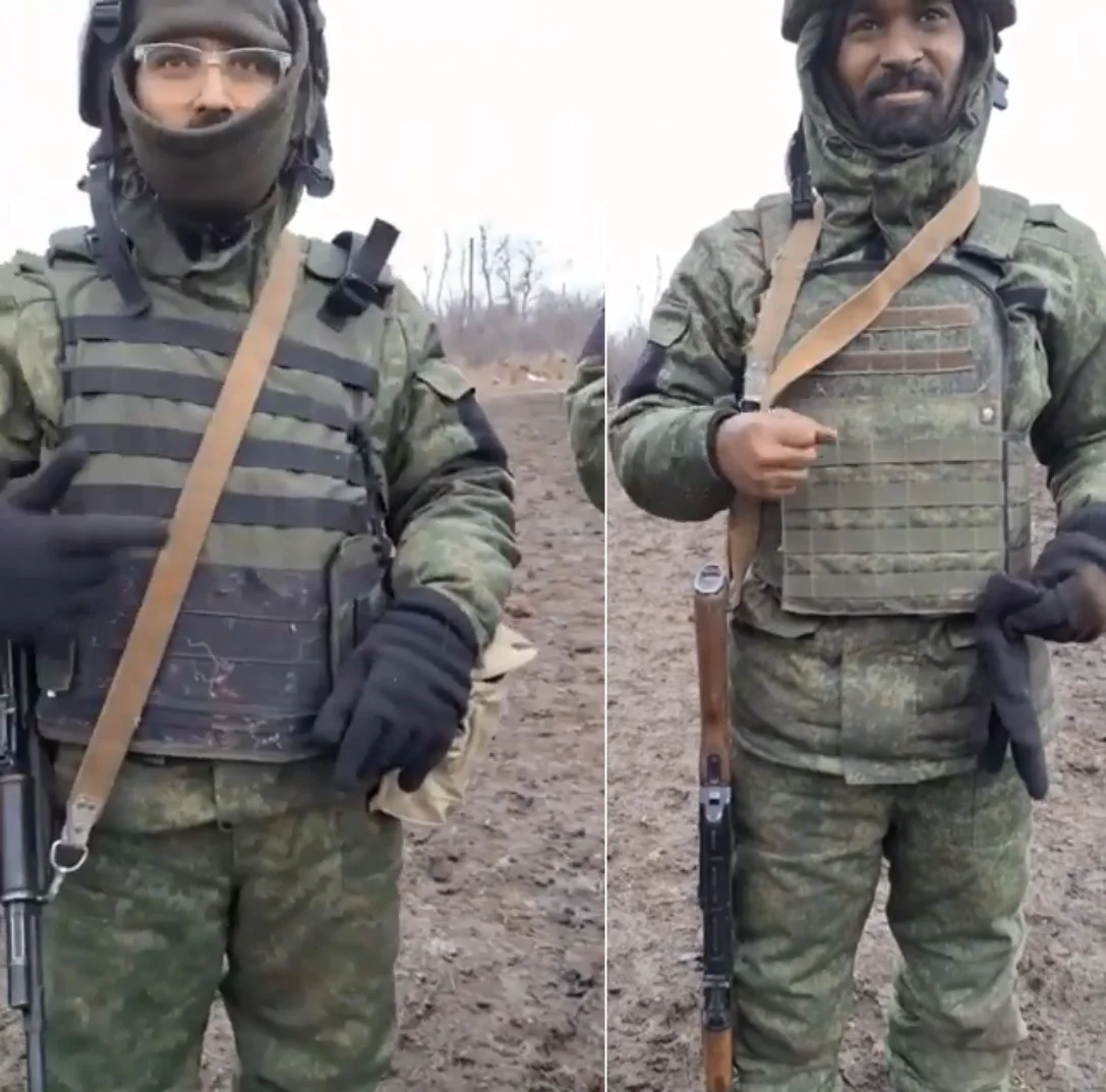 выстроенным в шеренгу контрактникам из Сомали, Индии и Сирии какая-то добрая женщина дарит перчатки со словами: «Очень было отрадно увидеть вас, которые приехали из других стран защищать нашу родину». А мужчина, снимающий их, дает им подсказку: «Теперь скажите: благодарю». Добровольцы благодарят и кланяются.