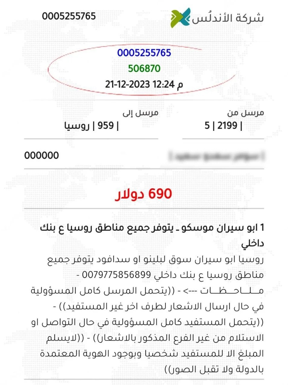 Имя получателя, сумма отправления — 690 долларов.