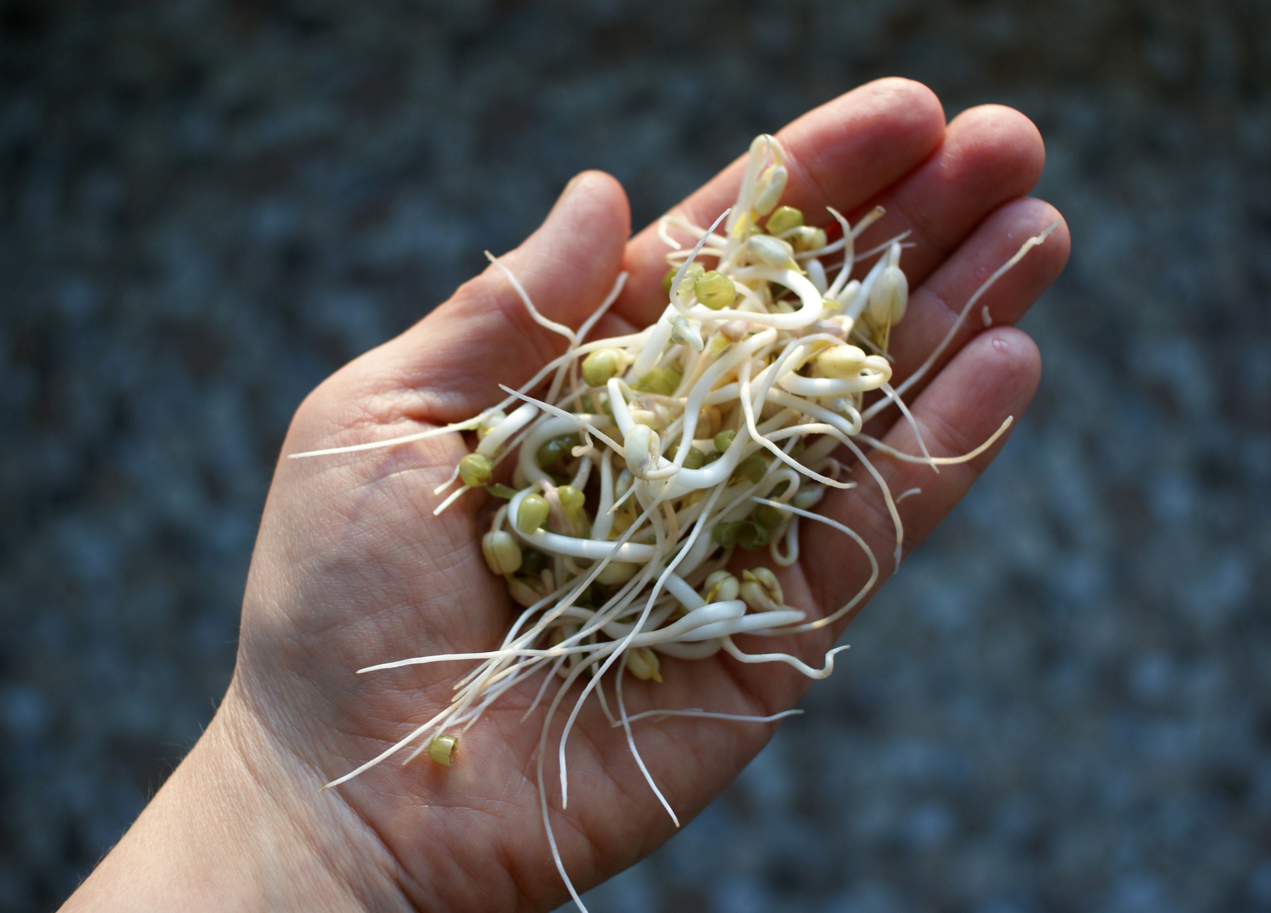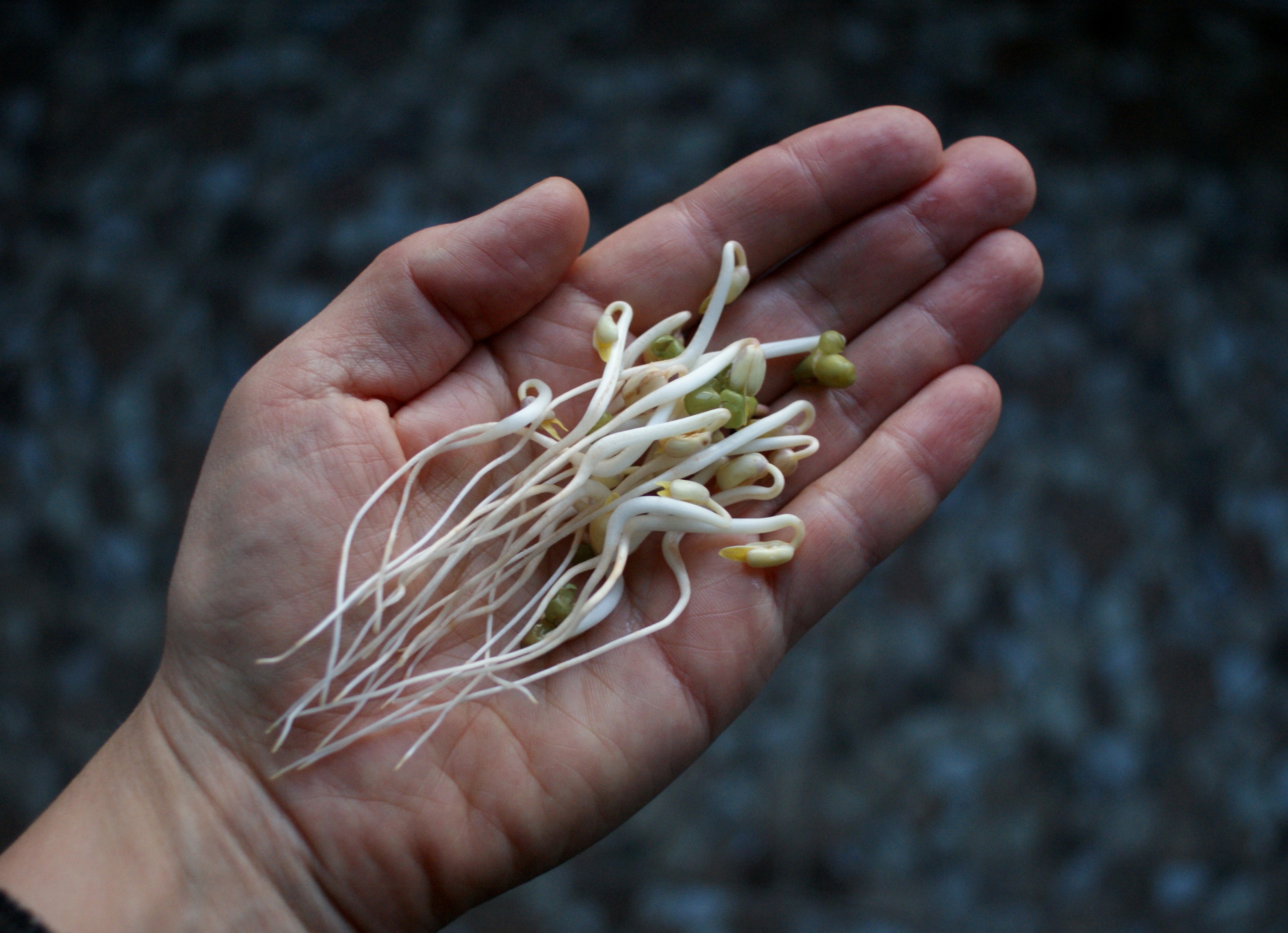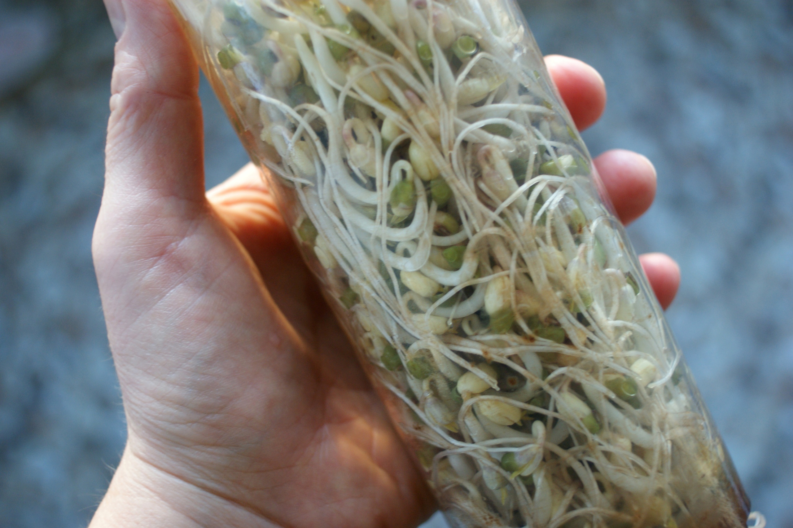 Вот, посмотрите — в колбе проращивателя мои ростки, которым уже четвёртый день. Я их ела вчера и позавчера. А утром взяла горсточку и пошла смотреть на утреннее небо. А колба всё ещё полная — как это возможно? Именно потому, что это живая, свежая, полезная еда. Я их ем, а они всё растут и растут. А ведь для выращивания целой колбы проростков я взяла всего лишь горстку малюсеньких зёрен маша)