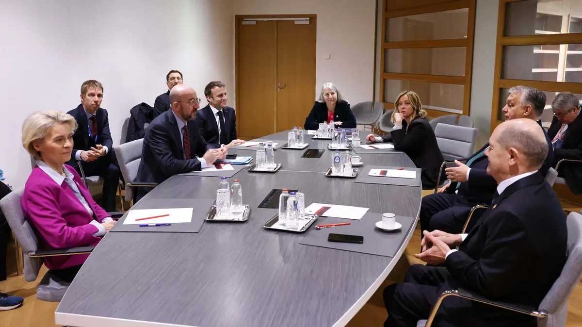 Глава Еврокомиссии Урсула фон дер Ляйен (слева), глава Европейского совета Шарль Мишель (второй слева), президент Франции Эмманюэль Макрон (третий слева), канцлер Германии Олаф Шольц (справа), премьер-министр Венгрии Виктор Орбан (второй справа), премьер-министр Италии Джорджа Мелони (третья справа) во время встречи на полях внеочередного заседания Европейского совета. Фото: Zuma TASS