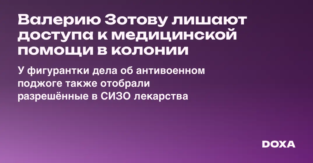 Валерию Зотову, осужденную за несостоявшийся поджог пункта сбора помощи военным, лишают доступа к медицинской помощи. В исправительной колонии у политзаключенной также отобрали лекарства, разрешенные в СИЗО.