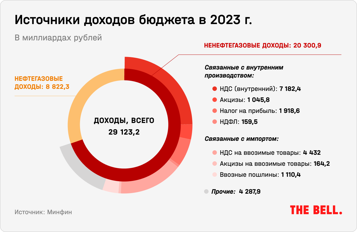В 2023 году из-за гигантских расходов на войну российский бюджет ожидаемо столкнулся с дефицитом в 2,9 трлн рублей. Но эта цифра могла быть еще больше, если бы падение доходов от нефти и газа не компенсировали рекордные ненефтегазовые доходы. Рассказываем, кто помогал правительству латать дыры в бюджете.