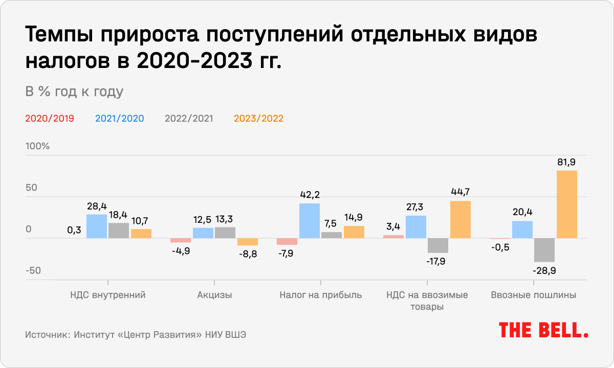 Рост НДС на ввозимые товары объясняется практически полным восстановлением импорта в деньгах до уровня 2021 года ($304 млрд), хотя в физическом выражении он остался на 4–5% ниже, объясняет главный экономист Bloomberg Economics по России Александр Исаков.