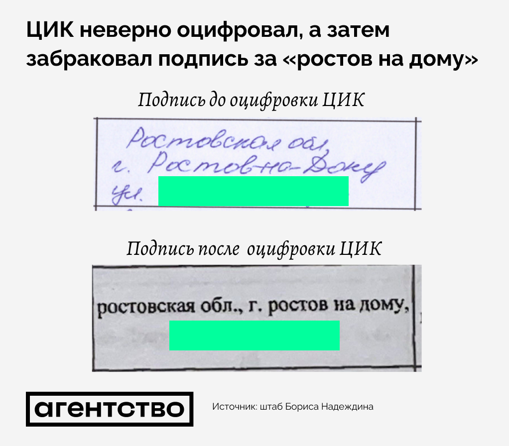 Политик Борис Надеждин во вторник опубликовал несколько подписей за его выдвижение на выборах президента России, которые ЦИК, по словам кандидата, сначала неверно оцифровал, а затем забраковал. Одна из забракованных подписей, в которой вместо города «Ростов-на-Дону» написано «ростов на дому», стала вирусной. «Агентство» связалось с ее автором, он подтвердил, что оставлял подпись, и предложил судить людей, ответственных за такие ошибки.