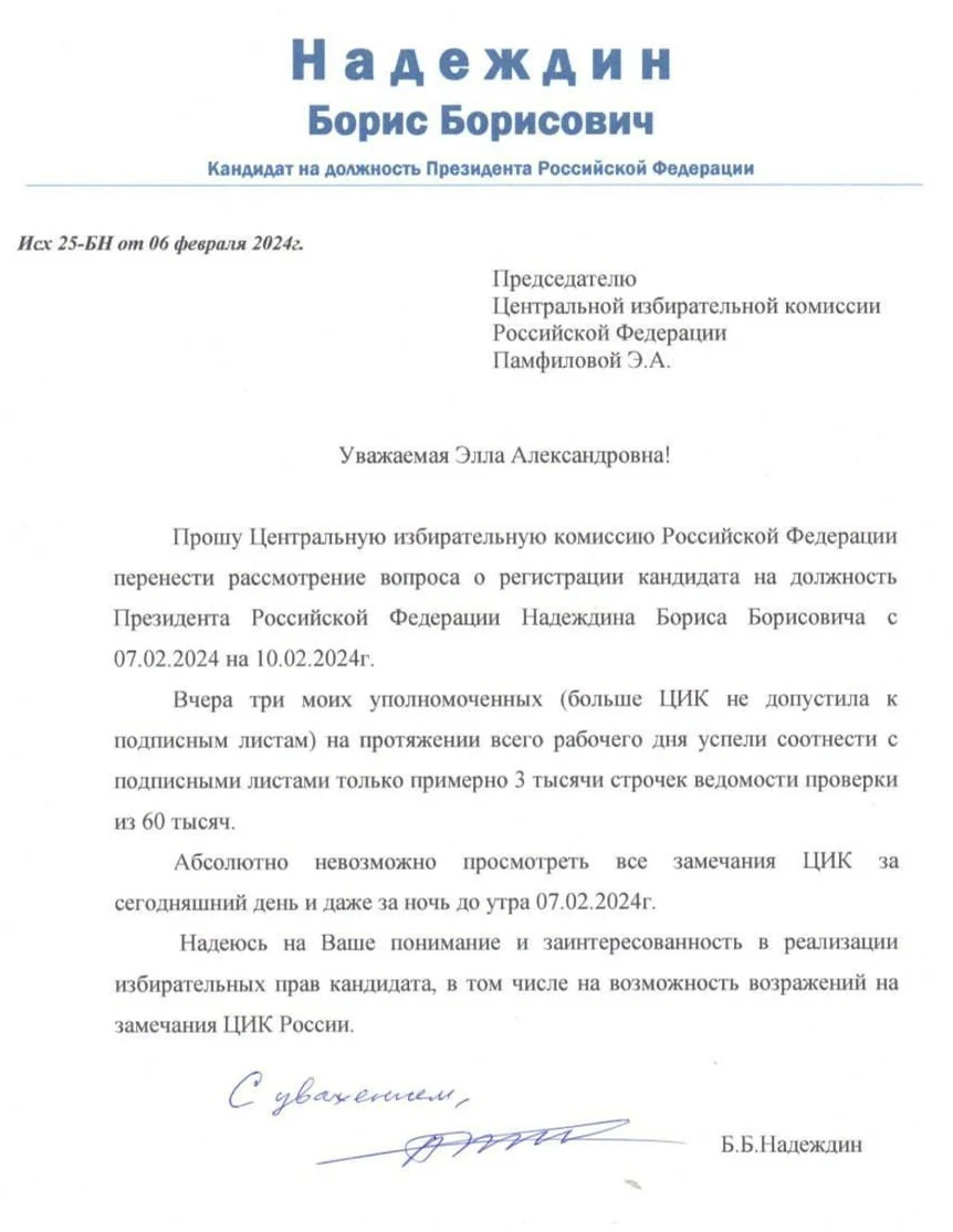 Штаб Надеждина отправил в ЦИК просьбу перенести заседание с 7 на 10 февраля, поскольку за выделенное время оказалось «абсолютно невозможно просмотреть все замечания ЦИК» и подготовить на них возражения.