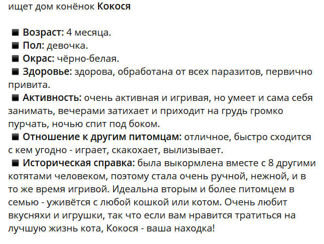 Больших надежд на ее пристройство у меня не было. Я думала, что это будет очень тяжело, потому что Кокося — обычный черно-белый котенок. Таких очень много. Но всё, к счастью, сложилось иначе.
