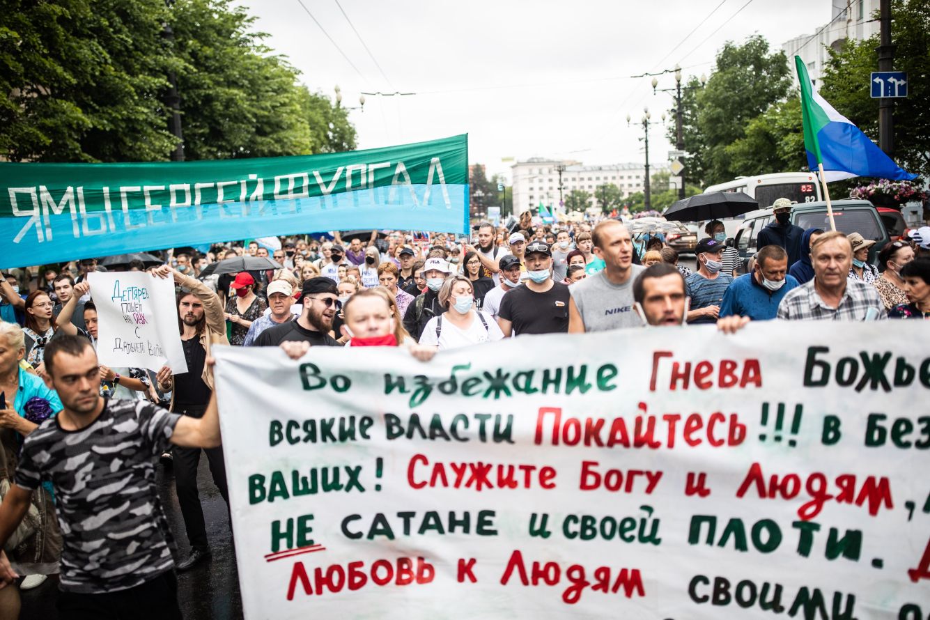 «Я/Мы Сергей Фургал» — пожалуй, самый популярный лозунг протестующих против задержания тогдашнего губернатора Хабаровского края Сергея Фургала. В 2020 году его обвинили в причастности к заказным убийствам, а в феврале 2023-го приговорили к 22 годам колонии строгого режима. Задержание спровоцировало массовые многомесячные протесты в регионе: митингующие были уверены, что преследование одного из немногих губернаторов, не представлявших «Единую Россию», политически мотивировано.