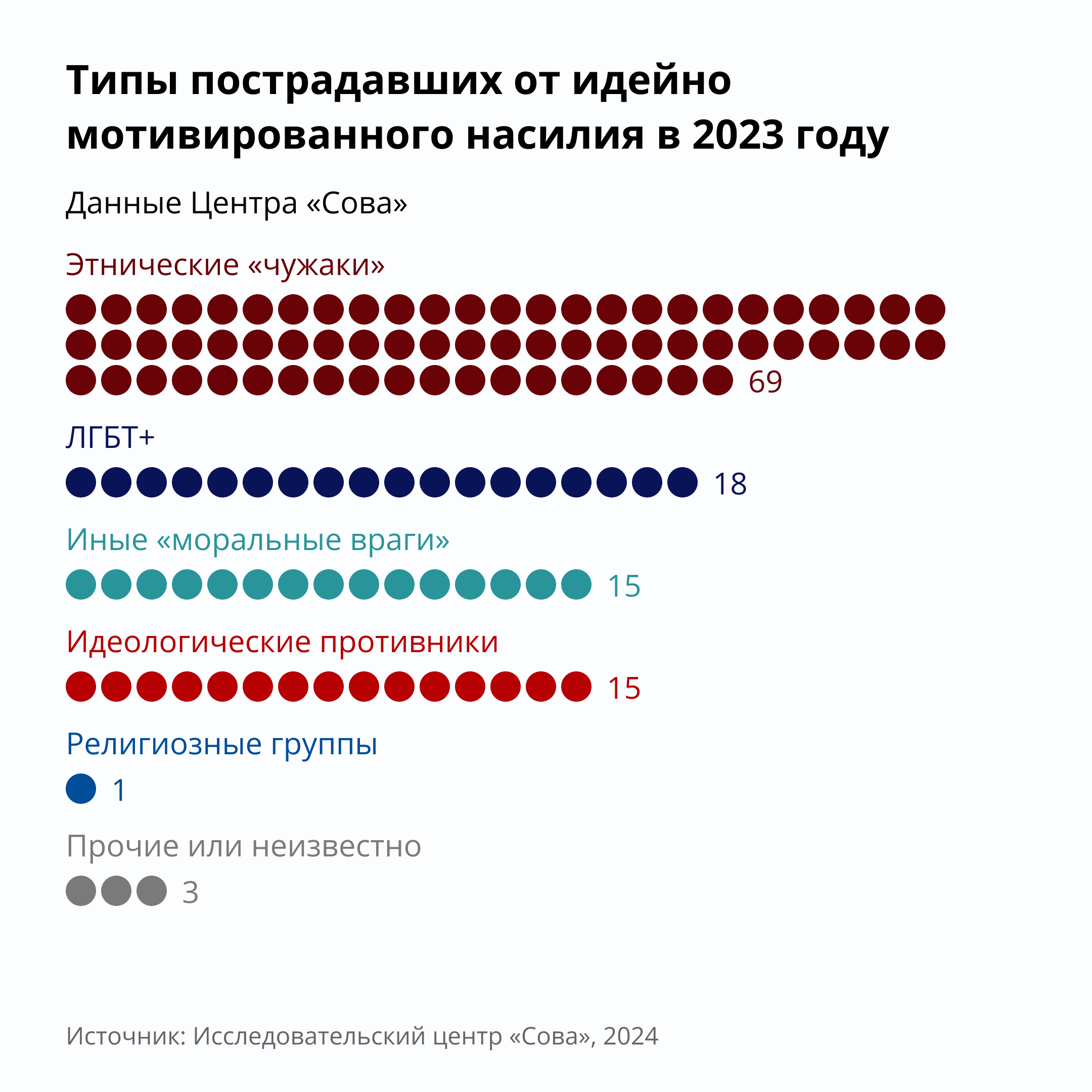 В 2023 году мы зафиксировали 69 нападений по этническому признаку, то есть на тех, кого атакующие визуально воспринимали как этнических чужаков. В 2022 году было зафиксировано девять нападений по этническому признаку. Но даже если исключить выбивающийся из общего ряда 2022 год с его невероятно низким числом актов насилия, и сравнить с данными за год до этого, рост в этой категории жертв очевиден: за 2021 год нам известно о 36 таких нападениях.