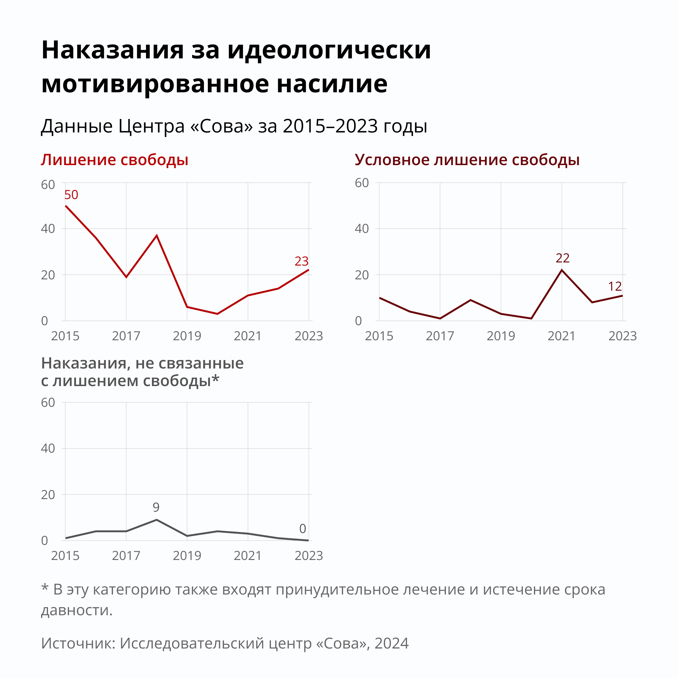 Почти треть осужденных в 2023 году (10 из 31, то есть 32 %) была приговорена к условным срокам. Условные сроки за насильственные преступления ненависти вызывают у нас большие сомнения, так как за годы нашего мониторинга мы неоднократно убеждались в том, что условные сроки за насилие не воспринимаются осужденными как наказание и не останавливают их от совершения подобных деяний в дальнейшем. В некоторых случаях мы можем понять мотивировку суда и признать допустимость таких решений, но в прошедшем году далеко не во всех таких случаях мы сочли условное наказание адекватным содеянному.