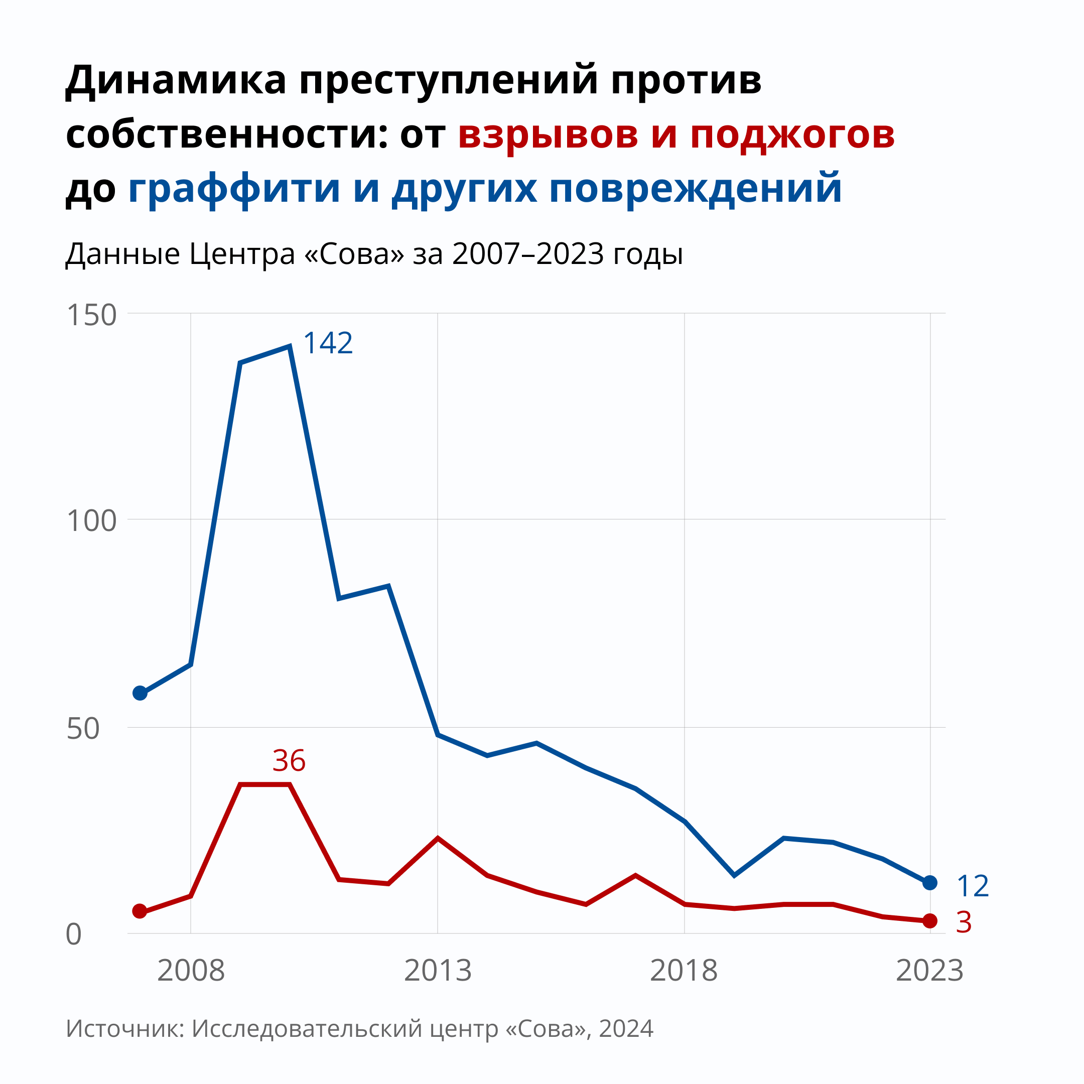 Как и в случае насильственных преступлений, мы не включаем в свои подсчеты покушения на материальные объекты по политическим или идеологическим соображениям (а таких эпизодов стало особенно много с 2022 года), помимо случаев, когда эти идейные соображения сами по себе связаны с ксенофобией. Не включаются и эпизоды, квалифицированные как покушения на материальный объект, например, «Вечный огонь», при которых материальный ущерб нанесен просто не был[28].