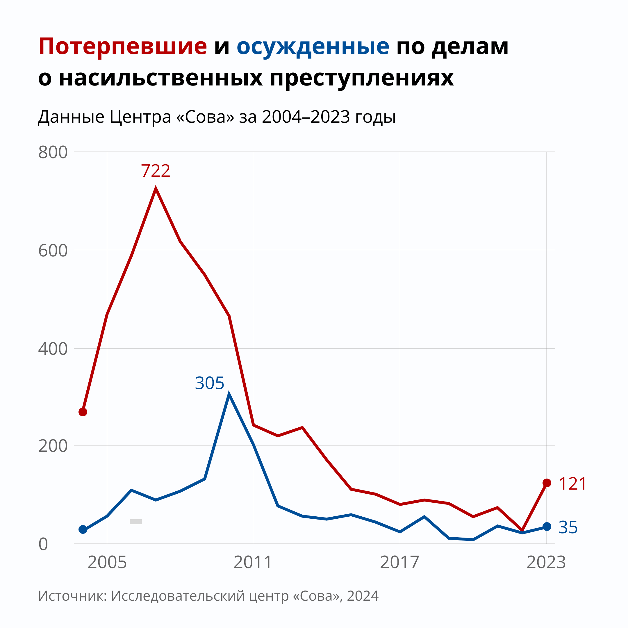 Количество осужденных за насилие, совершенное по мотиву ненависти, по сравнению с предыдущим годом выросло незначительно. В основном в прошедшем году правоприменение шло по уже накатанной в предыдущие годы колее, заканчивая начатые ранее громкие процессы. За убийства 2003 и 2007 годов были вынесены приговоры известным в прошлом неонацистам, о задержаниях которых сообщалось двумя годами ранее. В 2023 году было осуждено несколько человек, задержанных в предыдущие два года в ходе массовой облавы по всей России на признанную террористической сеть М.К.У.