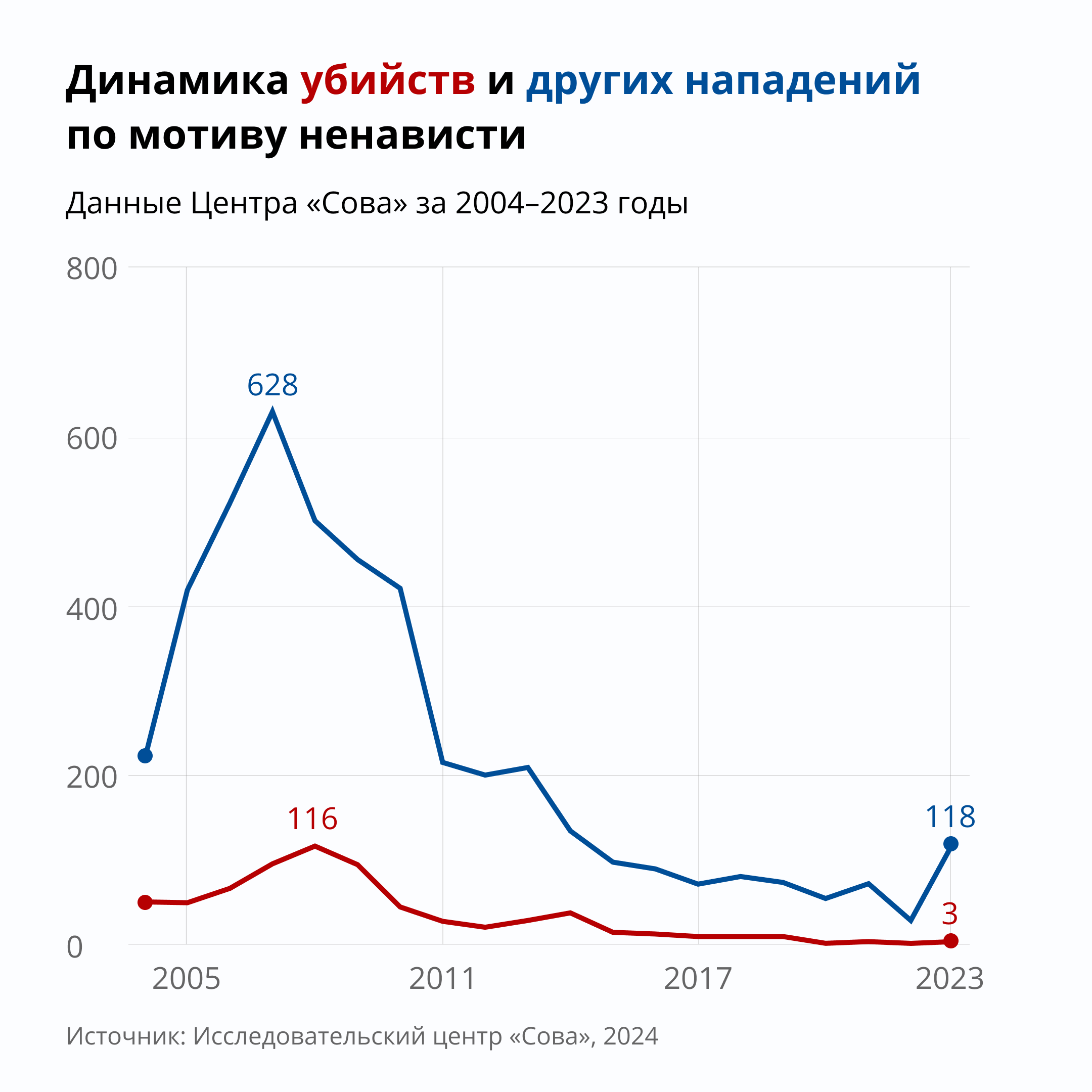 Итоги прошедшего года вызывают тревогу. С весны 2023 года мы фиксируем бурный рост расистского насилия. В первую очередь этот рост произошел за счет тех, кого нападавшие выбирали по этническому признаку. Однако заметно выросло количество нападений и на все остальные группы жертв – на неформальные молодежные группы, политических противников (антифашистов, анархистов и коммунистов), на ЛГБТ+-людей, на тех, кто, по мнению нападавших, ведет неправильный образ жизни (бездомных, нетрезвых, наркопотребителей и т.д.).