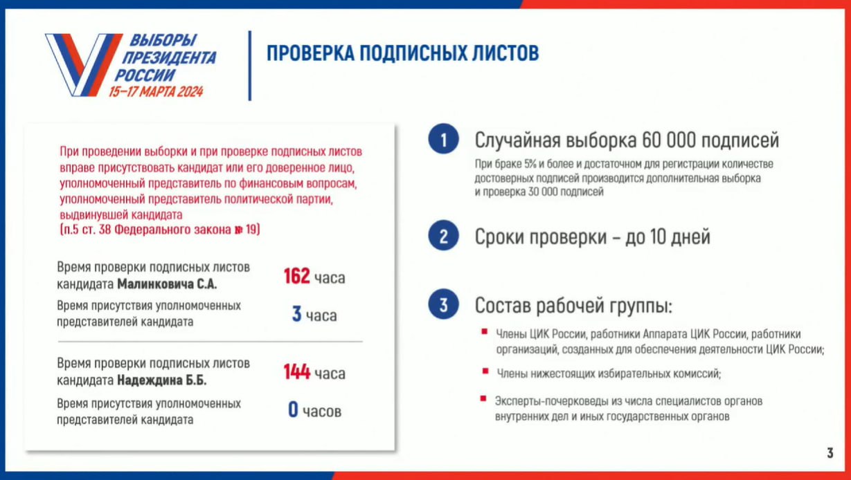 Спустя два дня зампредседателя Центральной избирательной комиссии Николай Булаев сказал, что в подписях потенциальных кандидатов в президенты Бориса Надеждина и Сергея Малинковича нашли ошибки. Их пригласили на заседание рабочей группы ЦИК 5 февраля, чтобы сообщить им о претензиях к подписям. В этот день стало известно, что ЦИК забраковала 15,35% подписей, собранных за выдвижение Бориса Надеждина. Это больше допустимой доли брака, прописанной в законе о выборах, — 5%.