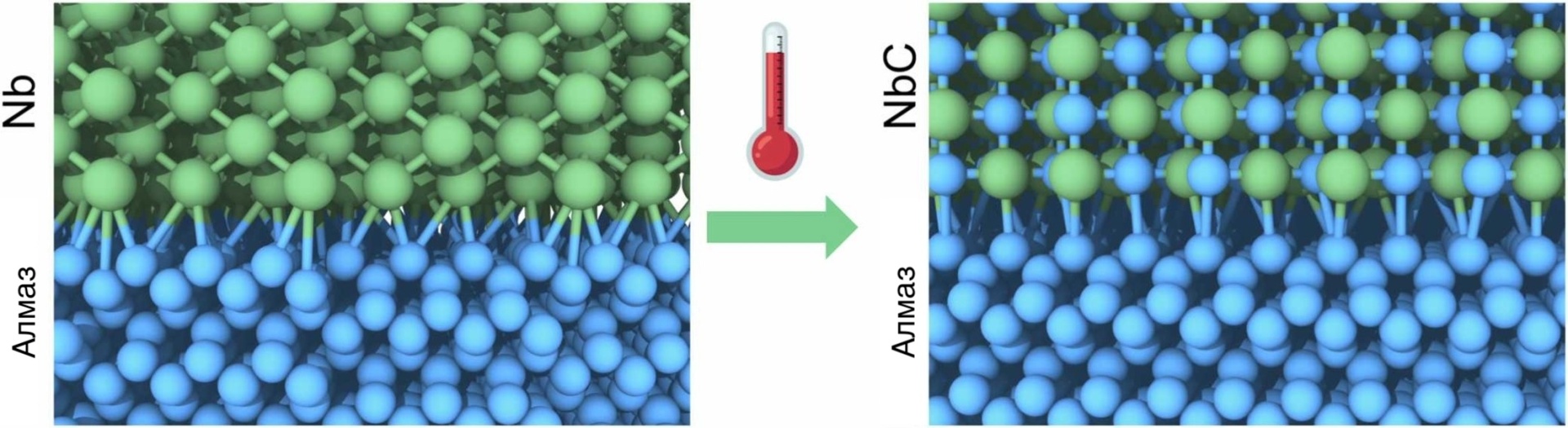 «Мы попытались сделать сверхпроводник на поверхности алмаза и пришли к тому, что если на нее наносить ниобий, а потом его отжигать и получать карбид ниобия, то при отжиге происходит химическая реакция с поверхностью и возникают следующие превращения: пленка ниобия после нагрева переходит в соединение Nb₂C, и после дальнейшего нагрева больше 1200 ℃ она переходит в NbC», — продолжил Станислав Евлашин.