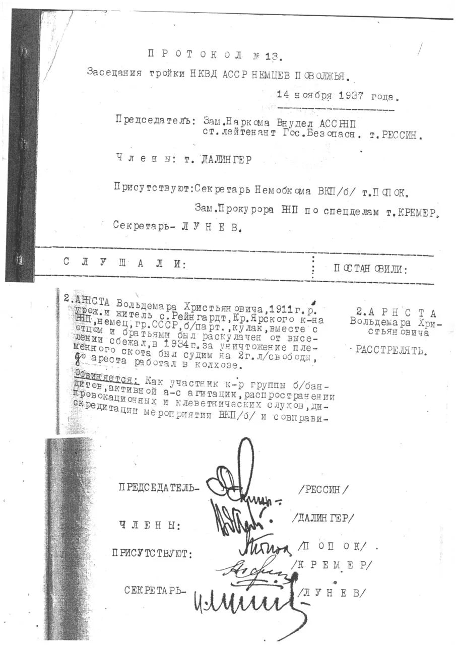 – В моем случае да. В своей книге я рассматриваю 11 биографий конкретных людей, которые оставили свои подписи. "Тройка" состояла из одного председателя, одного члена этой "тройки" и двух просто присутствующих человек. Те двое присутствующие не были официальными членами "тройки". И секретарь. Всего пять человек – пять подписей. Председатель той "тройки" – Илья Залманович Рессин был расстрелян. Другой член – Владимир Далингер, как этнический немец был депортирован и попал в трудармию. Но он выжил, жил до 80-х годов и даже стал почетным пенсионером. Яков Попок – один из присутствующих, тоже расстрелян и похоронен на Коммунарке. Зампрокурора по спецделам Адольф Кремер тоже выжил и жил в Краснотуринске. Он как немец тоже попал под депортацию и в трудармию. До последних дней жизни выступал перед пионерами и рассказывал о своем прошлом. Его биография была очень интересной. Он служил матросом в Кронштадте и попал в революцию, встречал Ленина на Финляндском вокзале.
