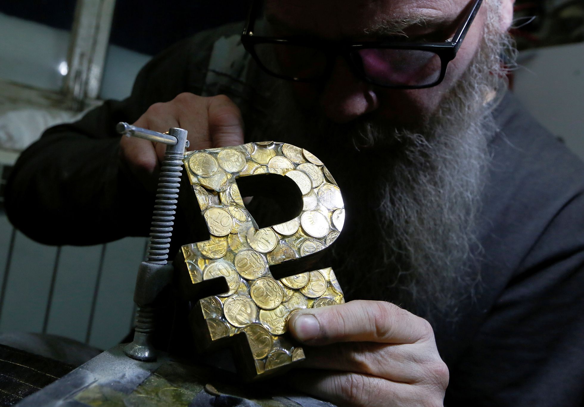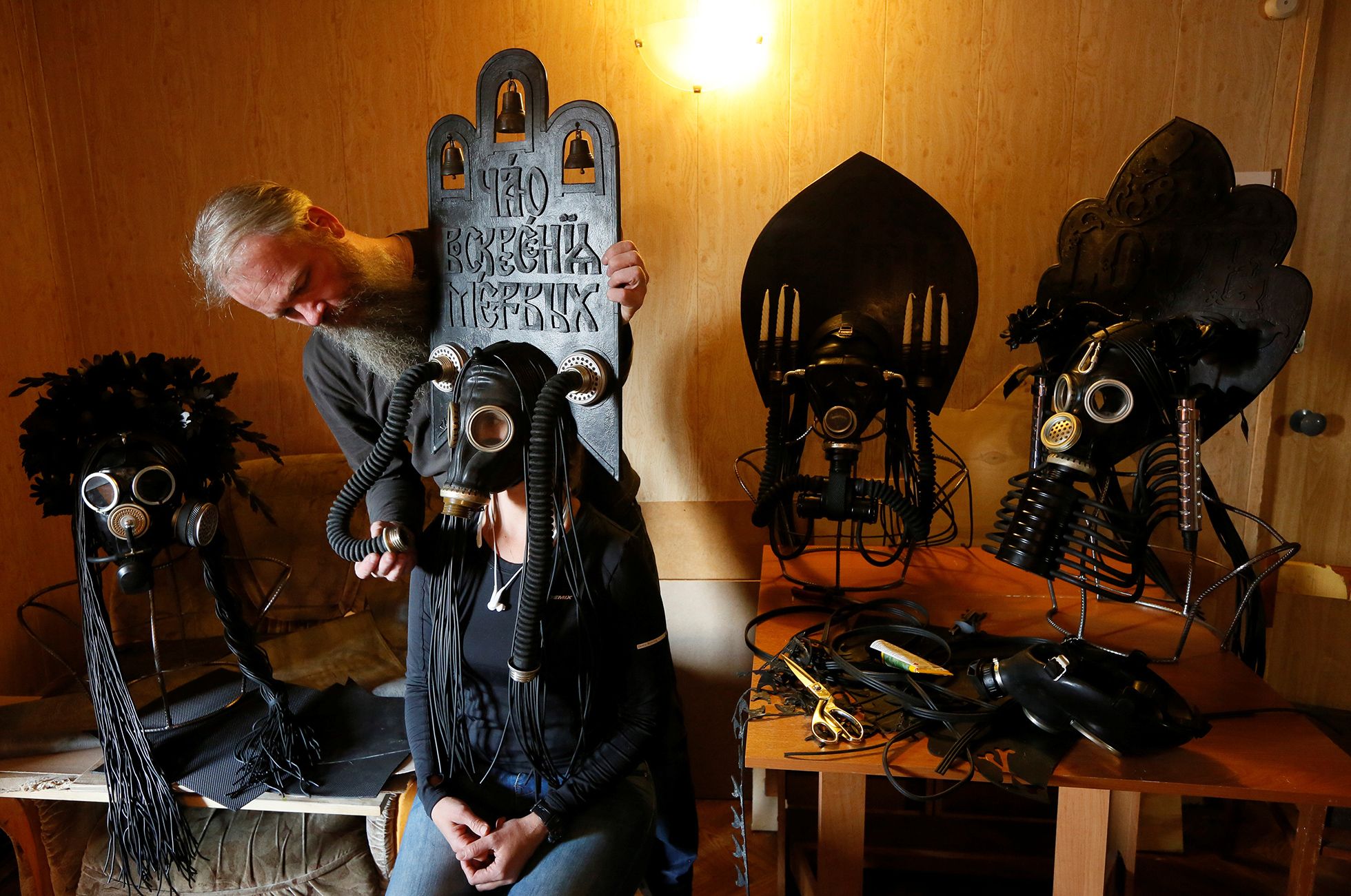 Каждый такой кокошник посвящен какому-нибудь советскому или российскому «бренду» — от ГУЛАГа и НКВД до Сбербанка с «Газпромом». Подразумевается, что слоган последнего — «национальное достояние» — относится и к остальным институтам: перед нами полный каталог «скреп», которыми гордится российский режим, и «скрепы» эти на вид очень тяжелые. Деталь костюма, которая в свое время стала отличительным знаком «русского стиля» в придворной моде и по сей день ассоциируется с праздничным образом России, благодаря металлу превращается то ли в шлем, то ли в орудие пытки.