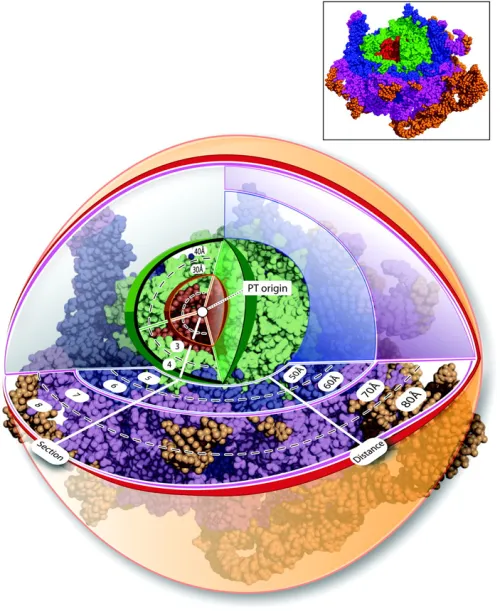 Так вот, что важно? Важно то, что с генетическим кодом, с матричной РНК работает малая субъединица рибосомы и декодирующий центр рибосомы, который всем этим занимается: он находится пространственно далеко (на расстоянии порядка 10 нм) от пептидилтрансферазного центра. Прямого контакта между ними нет. Транспортные РНК (такие маленькие РНК-носители, которые приносят новую аминокислоты в рибосому) одним концом входят в пептидилтрансферазный центр, другим — в декодирующий. И это единственное, что связывает пептидилтрансферазный центр с декодирующим в процессе работы рибосомы. И если смотреть по а-минорным контактам, то те участки большой субъединицы рибосомы, которые контактируют с малой, моложе, чем пептидилтрансферазный центр. Если также смотреть направленные а-минорные контакты в малой субъединице рибосомы, то там тоже декодирующий центр — это самая древняя часть, а участки контакта с большой субъединицей моложе.