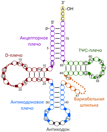 Как теперь от этого перейти к кодируемому белковому синтезу? Для этого надо, во-первых, чтобы появилась малая субъединица рибосомы и правильно соединилась с большой, а для этого нужны адаптеры, т. е. молекулы транспортных РНК, которые являются такими главными молекулярными мостами между последовательностью нуклеиновой кислоты и последовательностью белка. Рибосому можно обмануть, если подсунуть ей аминокислоту на не своей, не соответствующей ей транспортной РНК. Рибосома тогда сделает неправильный белок; у нее нет никаких средств эту ошибку заметить и тем более исправить. А вот у транспортной РНК-адаптера, с одной стороны, есть так называемая антикодоновая петля, в которой есть антикодон, три нуклеотида, комплементарные трем нуклеотидам в матричной РНК, кодирующим ту самую аминокислоту (см. схему вторичной структуры тРНК). И, с другой стороны, у нее есть акцепторный стебель, на который присоединяется аминокислота. В современном мире правильное соединение аминокислот — это работа семейства из 20 ферментов аминоацил-ТРНК-синтаз. Их 20 — по одному на каждую аминокислоту — каждый опознает соответствующие этой аминокислоте транспортные РНК. (Транспортных РНК на самом деле больше 20, их порядка 40 или 50 у разных организмов, потому что кодонов в генетическом коде всего 64, из них 61 кодируют те или иные аминокислоты.) Поэтому для опознания всех кодонов нужно больше 20 вариантов антикодонов. Точность, соответствие аминокислоты и транспортной РНК, проверяет только аминоацил-ТРНК-синтаза.