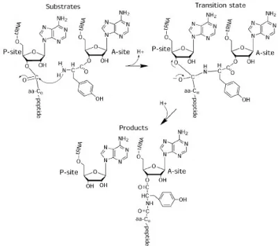 Значит, во-первых, рибосома состоит из двух химических компонент: из РНК нуклеиновой кислоты и из рибосомных белков. Что делает рибосома, если разбираться конкретно? Основная химическая реакция, которую катализирует рибосома, — это пептидилтрансферазная реакция, т. е. перенос пептидной цепочки растущего белка на молекулу следующей аминокислоты. При этом происходит удлинение цепочки на одну аминокислоту. Эта реакция происходит в пептидилтрансферазном центре рибосомы, и из изучения структуры рибосом видно, что никаких рибосомных белков в пептидилтрансферазном центре нет. Он образован только рибосомной РНК, и механизм катализа в нем обеспечивается только РНК. То есть рибосома — это самый главный, самый важный рибозим, присутствующий в любой живой клетке. Это указывает на принципиальную возможность работы рибосомы в какой-то древней, примитивной, вообще без белков среде. Так что парадокс курицы и яйца у нас на этом месте не возникает: для синтеза первых белков не обязательно уже иметь готовые белки. Голая РНК с этим может справиться.