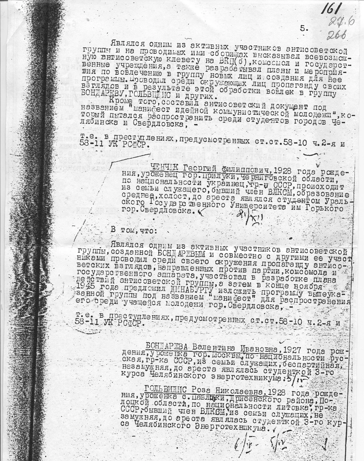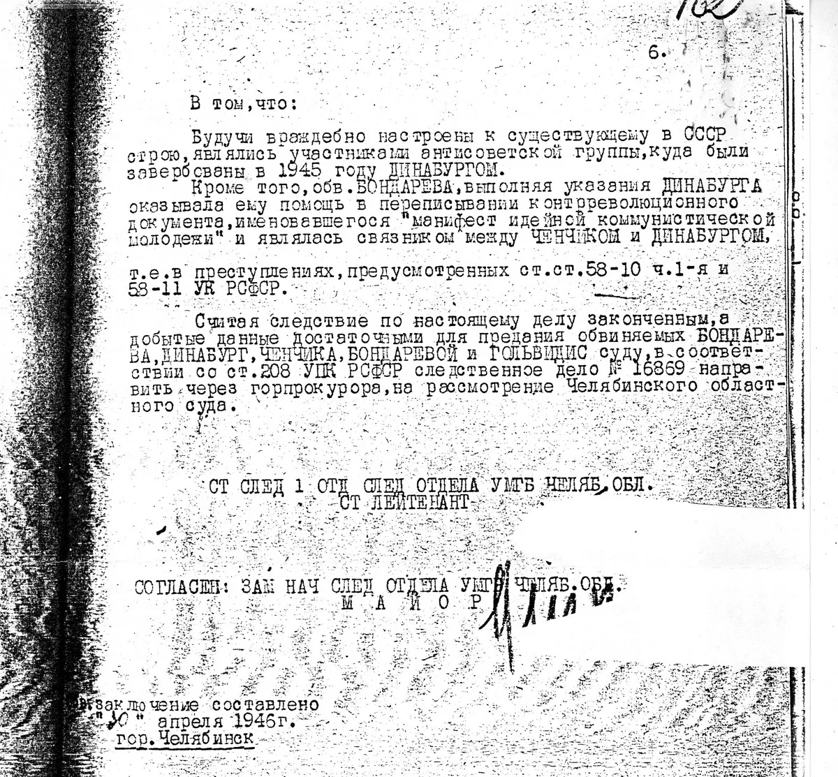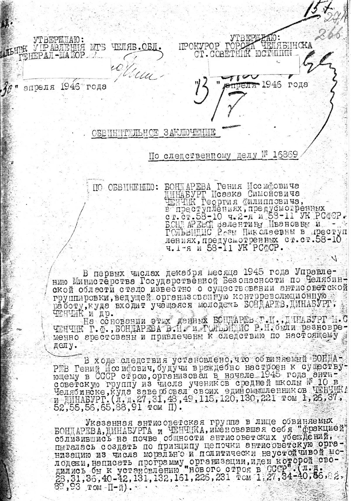«В первых числах декабря 1945 года управлению МГБ по Челябинской области стало известно о существовании а/с (антисоветской) группировки, ведущей организованную контрреволюционную работу, куда входят учащаяся молодежь Гений Бондарев, Юрий Динабург, Георгий Ченчик и др. На основании этих данных Бондарев, Динабург, Ченчик, Валентина Бондарева (однофамилица Гения. — А. Т.) и Роза Гольвидис были разновременно арестованы и привлечены к следствию по настоящему делу.