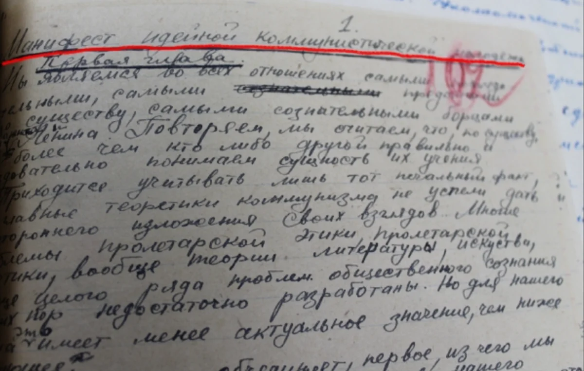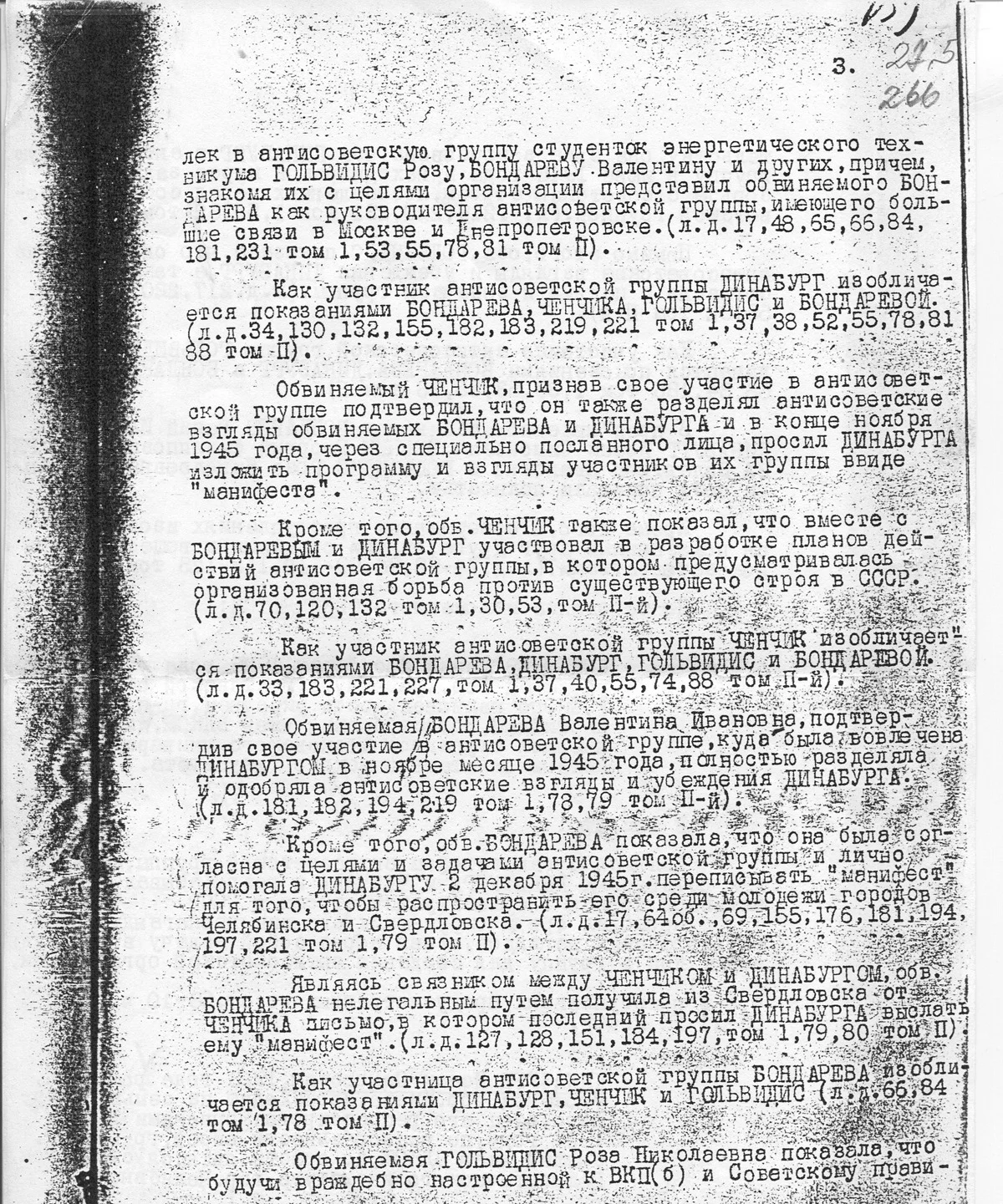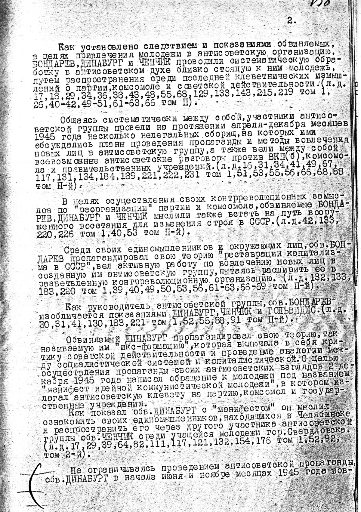 Обв. Бондарев пропагандировал свою теорию «реставрации капитализма в СССР», вел активную работу по вовлечению новых лиц в созданную им а/с группу, пытаясь расширить ее в разветвленную контрреволюционную организацию. Обв. Динабург пропагандировал свою теорию «икс-формации», которая включала в себя критику советской действительности и проведение аналогии между социалистической системой и капиталистической. 2 декабря 1945 года написал обращение к молодежи под названием «манифест идейной коммунистической молодежи». Как показал обв. Динабург, с «манифестом» он мыслил ознакомить единомышленников в Челябинске и распространить его через обв. Ченчика среди учащейся молодежи гор. Свердловска. (По окончании школы Бондарев поступил учиться в МГУ, Ченчик — в Уральский политехнический, Динабург — в Челябинский пед, на исторический. — А. Т.).