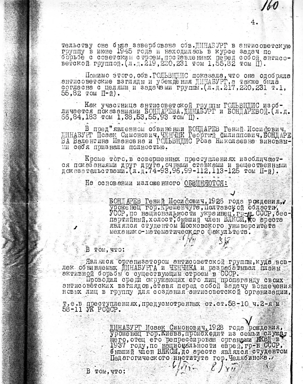 Обв. Бондарева, подтвердив свое участие в а/с группе, куда была вовлечена Динабургом, полностью разделяла и одобряла а/с взгляды и убеждения Динабурга и лично помогала ему 2 декабря 1945 года переписывать «манифест» для распространения среди молодежи Челябинска и Свердловска. Являясь связником между Ченчиком и Динабургом, обв. Бондарева нелегальным путем получила из Свердловска от Ченчика письмо, в котором последний просил Динабурга выслать ему «манифест».