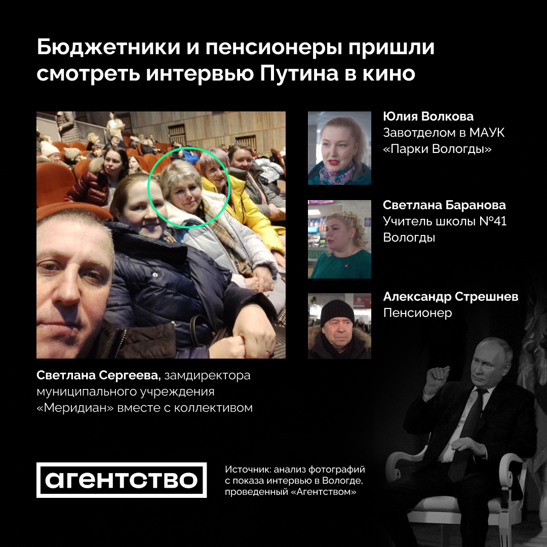 Сотрудники госучреждений Вологды и пенсионеры пришли в кинотеатр на организованный местными властями показ интервью Владимира Путина американскому журналисту Такеру Карлсону. На это указывает анализ лиц зрителей, проведенный «Агентством». Власти города после показа утверждали, что «никто не сгонял» студентов и детей, а в числе зрителей называли лишь ветеранские организации.