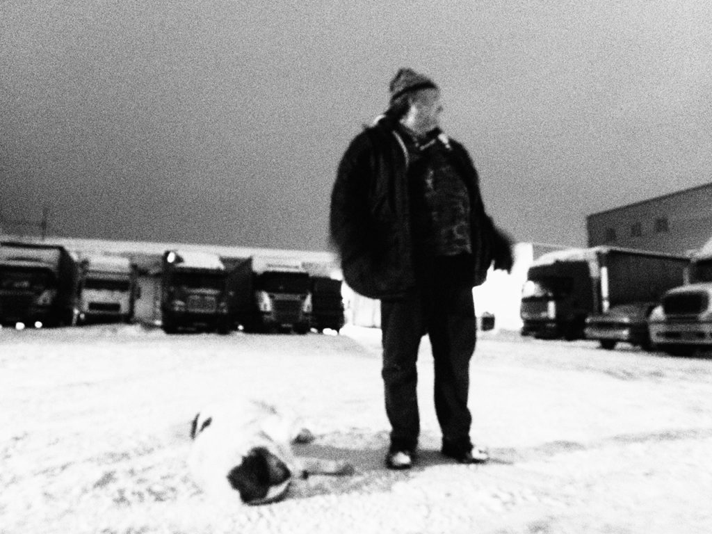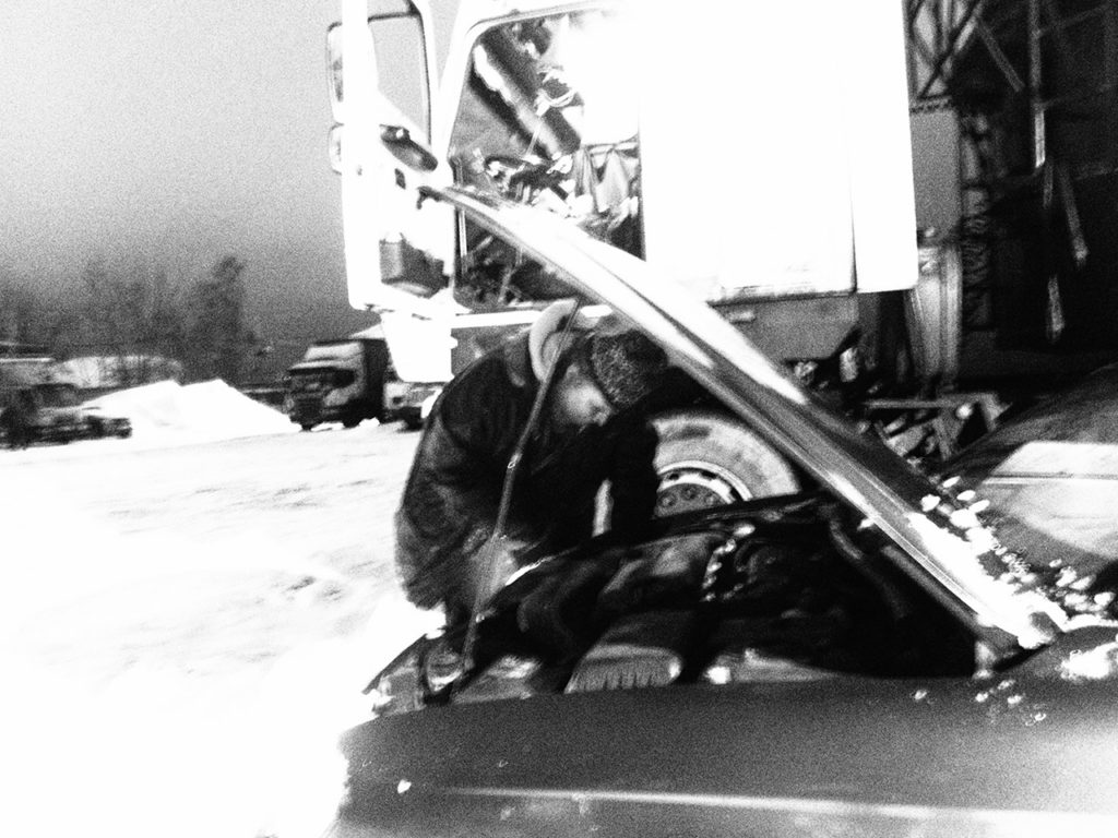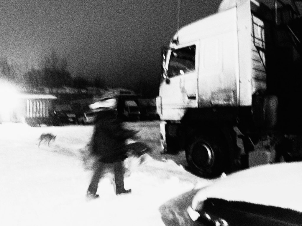 В проулке открываются ворота. Звонит телефон, на экране высвечивается «Слава Хозяин». «Да, Слав, алло. Да, меня уже грузят, все путем. Пока не знаю. Тут асфальта нету, ледяной накат, но чищено, не провалишься», — говорит Инга в трубку.