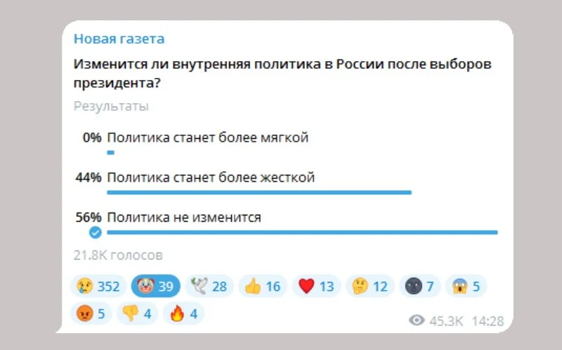 И чтобы подтвердить гипотезу о массовом походе россиян по жизни с головой, низко опущенной в настоящее, и согласившись с тем, что, ну ок, так и быть, март так март, мы задали вопрос подписчикам телеграм-канала «Новой газеты», спросив их: изменится ли политика в России после выборов президента, или нет, с вариантами ответов: «станет лучше», «станет хуже», «ничего не изменится». И результат этого нашего эксперимента превзошел все мои самые смелые ожидания.
