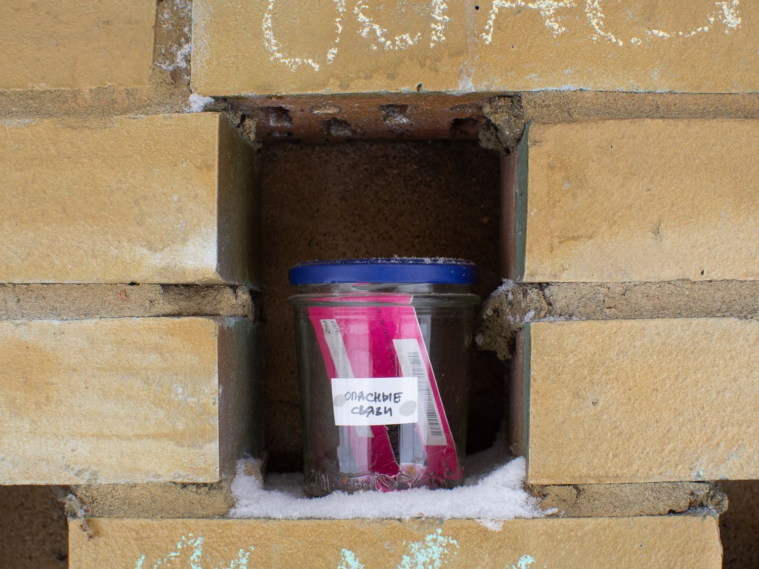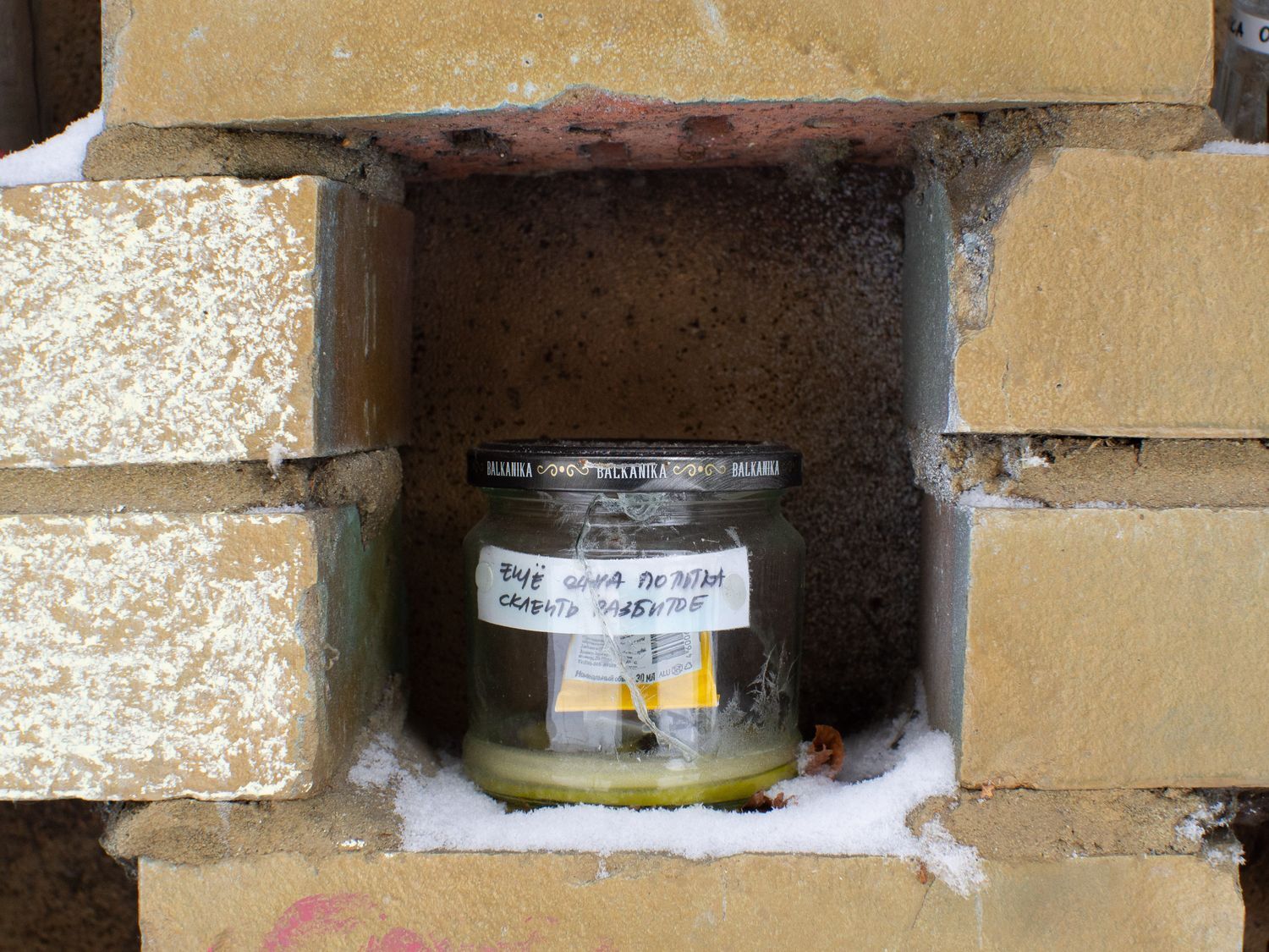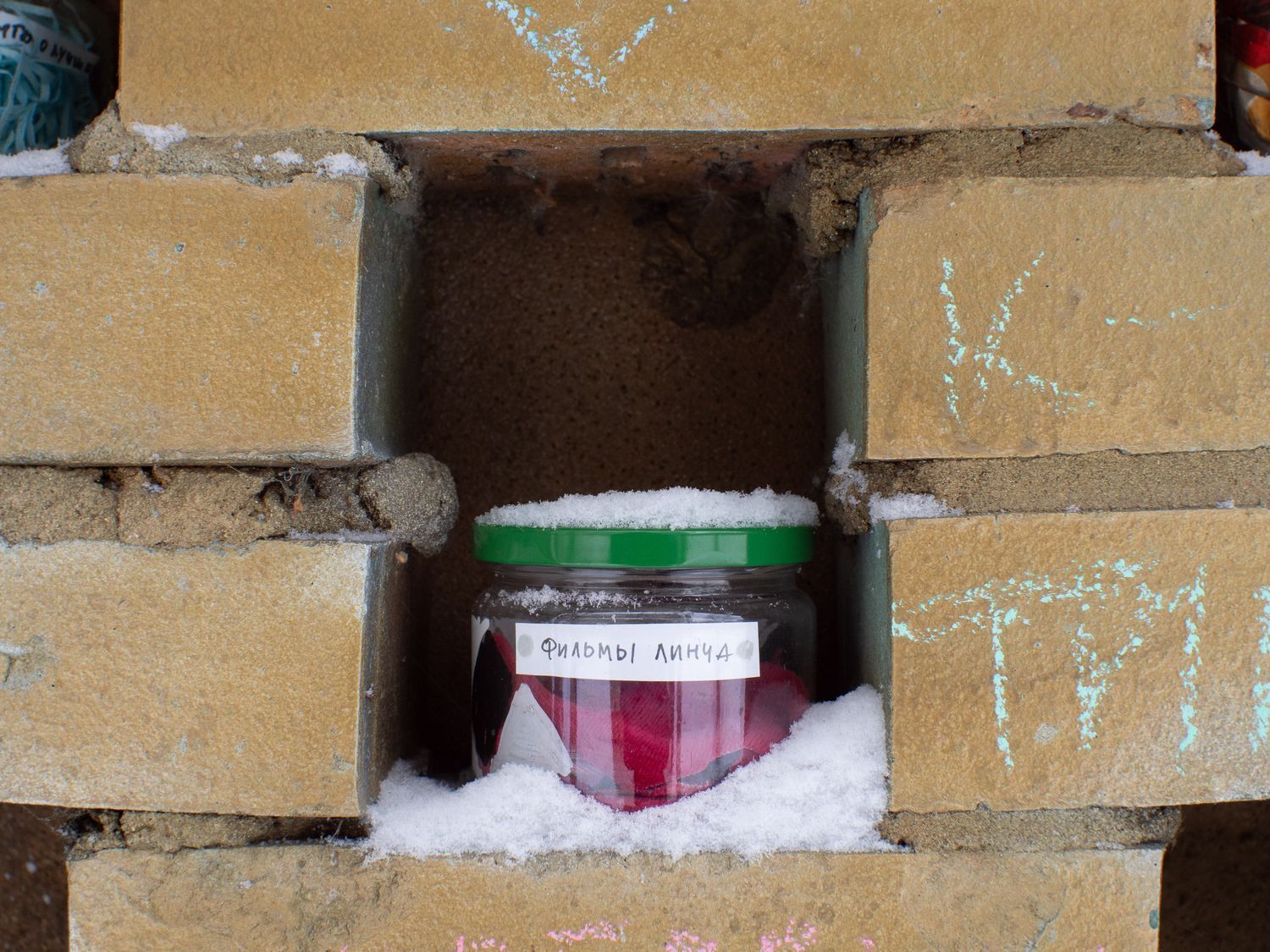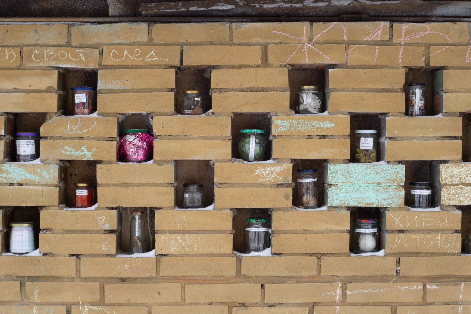 В одном из дворов у площади Мужества в стене гаража появились загадочные баночки, расставленные в углублениях между кирпичей. В каждой из них — игрушки, фантики, засушенные растения, и на каждой есть подпись: «желание праздника», «игра в себя». Некоторые намекают на текущие события: «весна войны», «довоенная вода», «эмиграция».