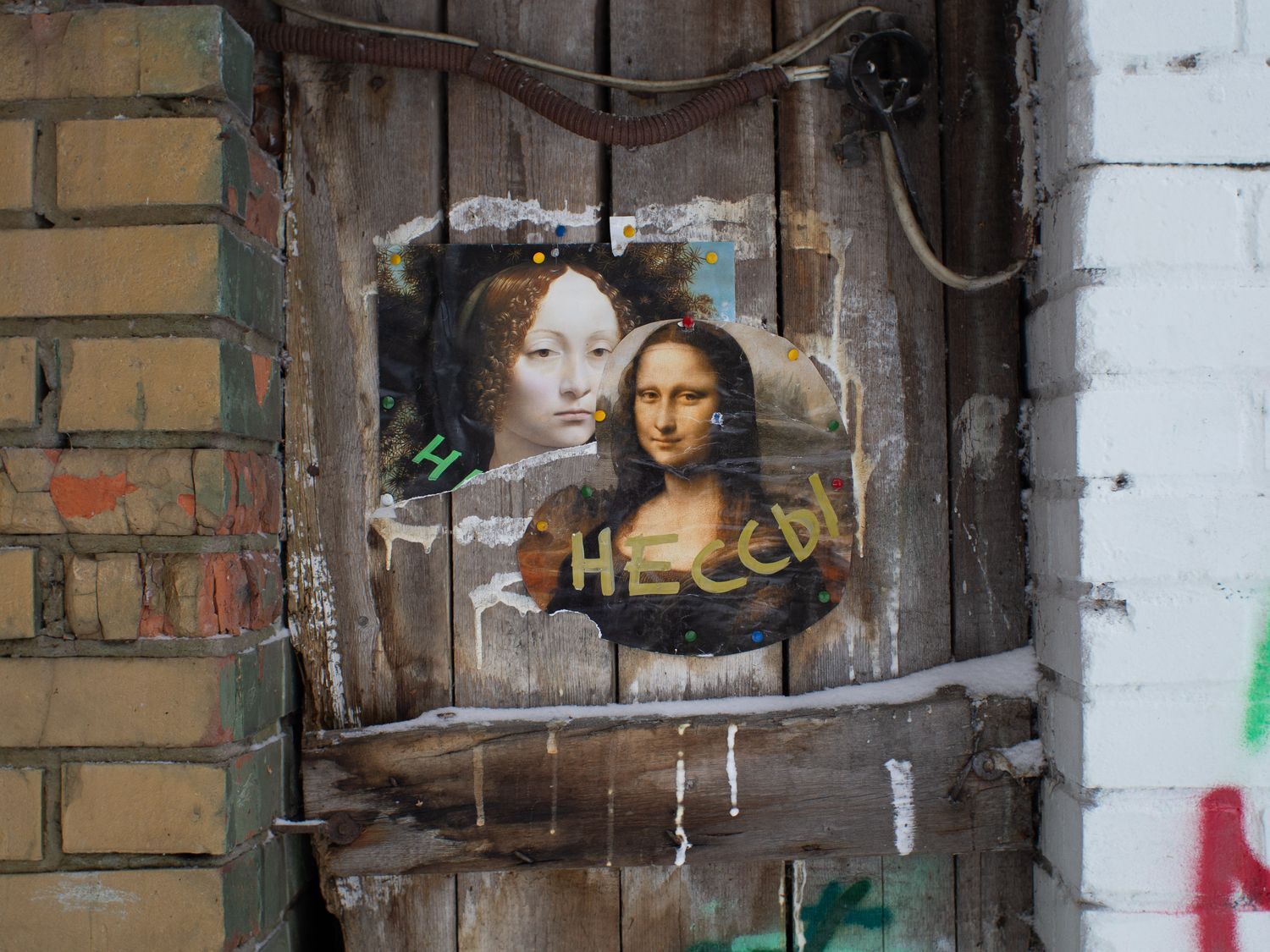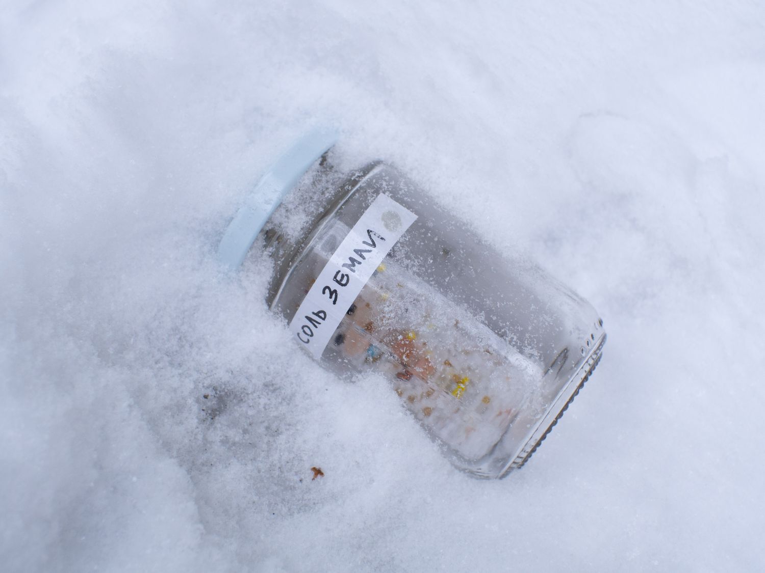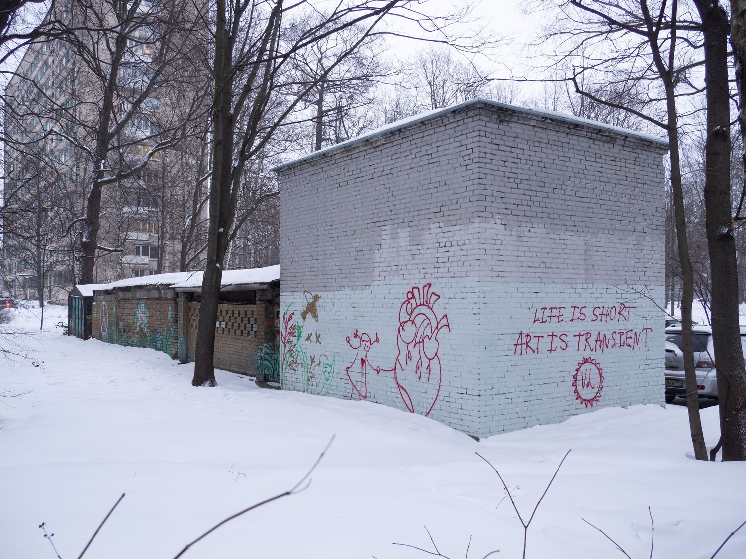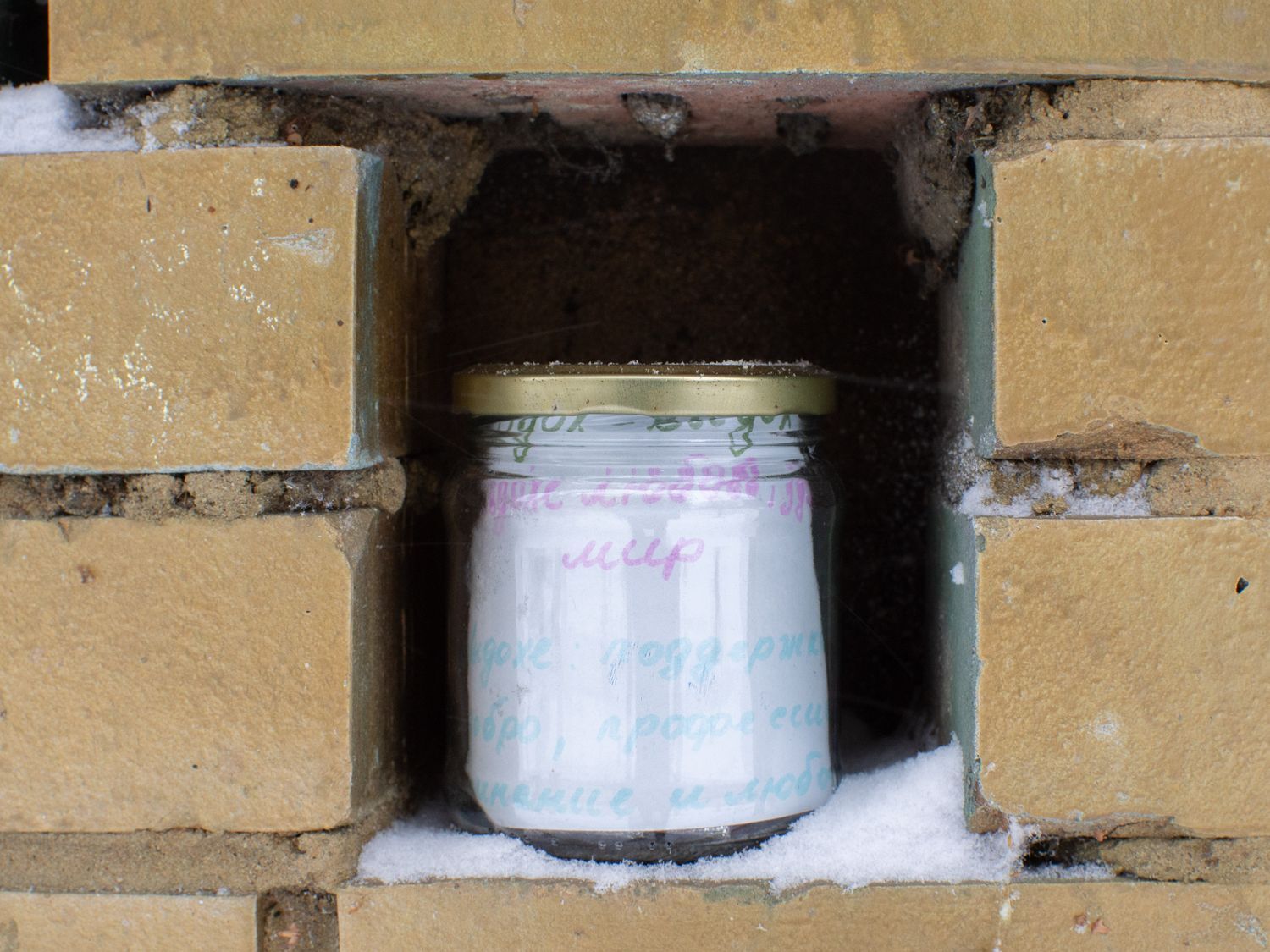 В одном из дворов у площади Мужества в стене гаража появились загадочные баночки, расставленные в углублениях между кирпичей. В каждой из них — игрушки, фантики, засушенные растения, и на каждой есть подпись: «желание праздника», «игра в себя». Некоторые намекают на текущие события: «весна войны», «довоенная вода», «эмиграция».