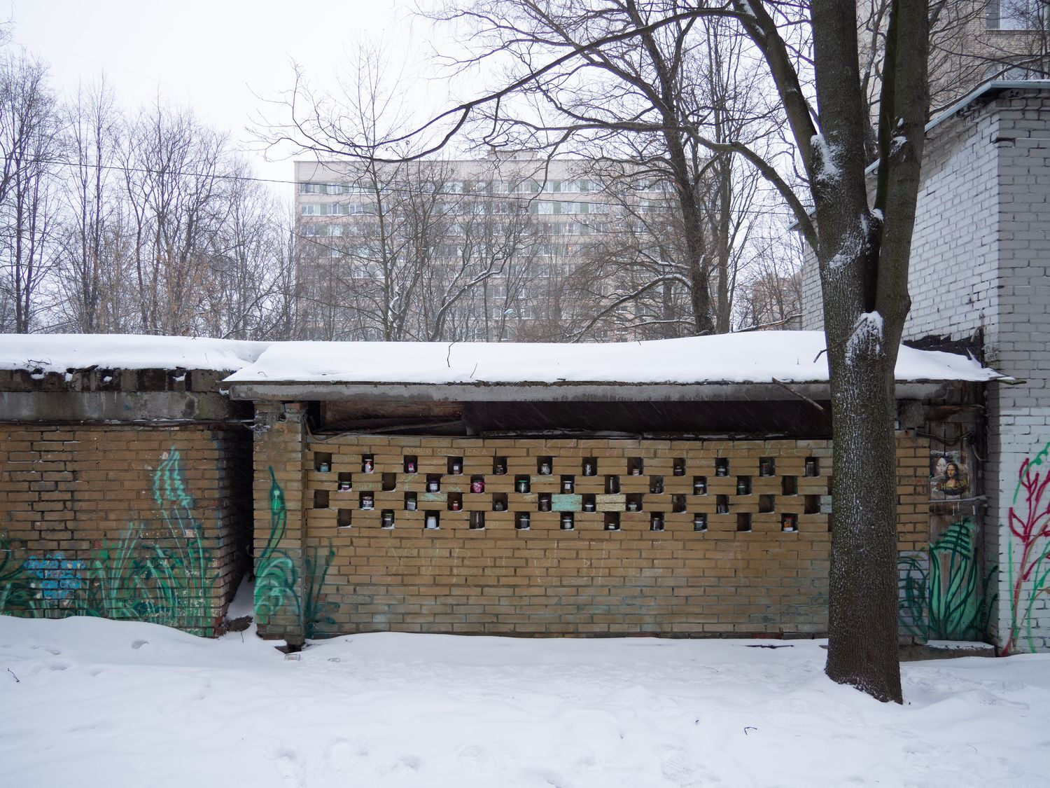 Место баночкам нашлось в углублениях между кирпичами в стене гаража, который петербурженка украсила еще до задумки с «колумбарием» — такой подарок она сделала себе перед новым 2022-м годом.