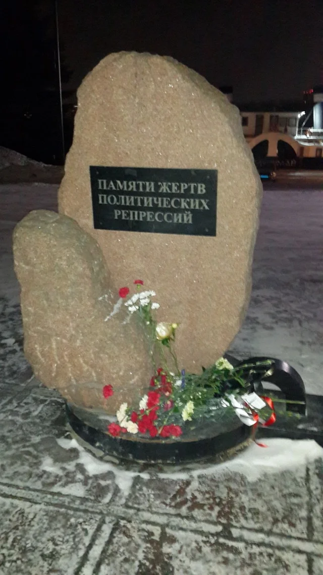 В Красноярске вечером пятницы люди несут цветы к памятнику жертвам политических репрессий. В основном, это белые и красные гвоздики. Некоторые перетянуты не черными, а белыми лентами — видимо, в память о событиях и упущенных шансах 2011-2012 годов. Минус 24, все цветы, лежащие у камня, — свежие.