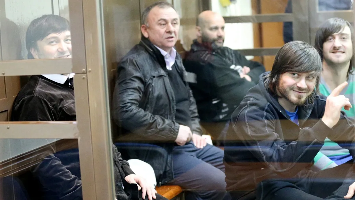 Рустам Махмудов, Лом-Али Гайтукаев, Сергей Хаджикурбанов, Джабраил Махмудов и Ибрагим Махмудов во время рассмотрения дела об убийстве Анны Политковской в Мосгорсуде. 2014 год. Фото: ИТАР-ТАСС / Михаил Почуев