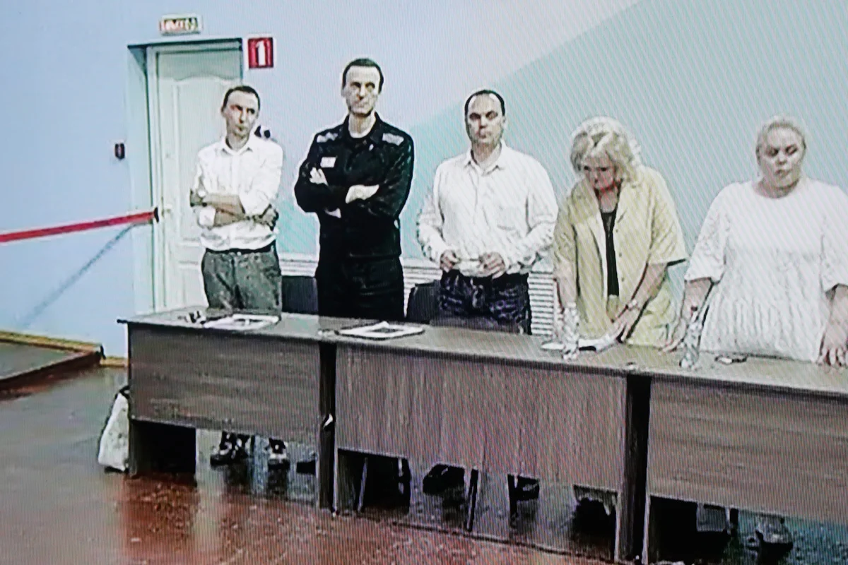 Алексей Навальный на экране видеосвязи из колонии во время слушаний о его праве на переписку в Верховном суде РФ в Москве, Россия, 22 июня 2023 года. Фото: Сергей Ильницкий / EPA-EFE