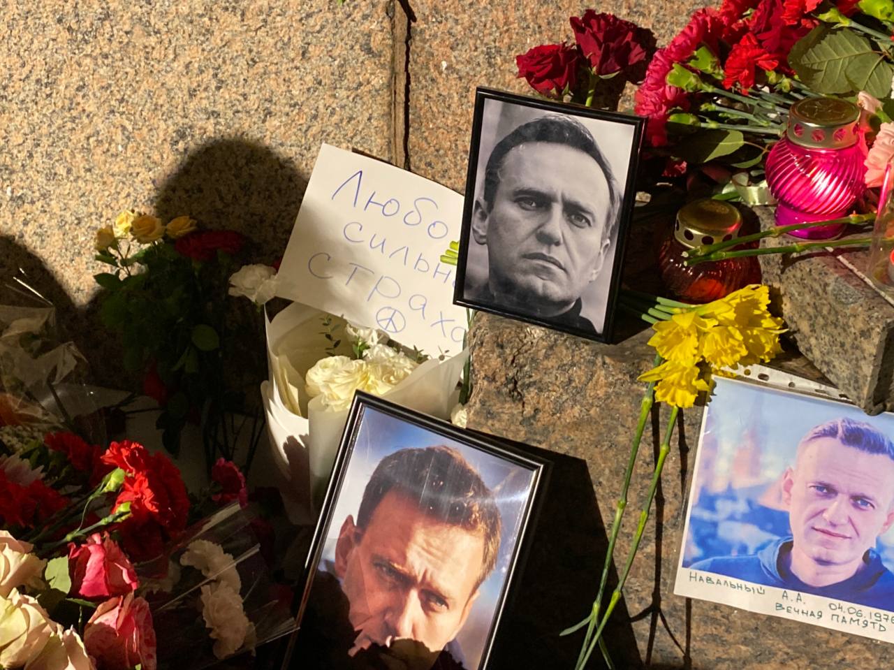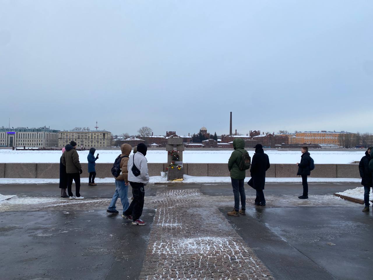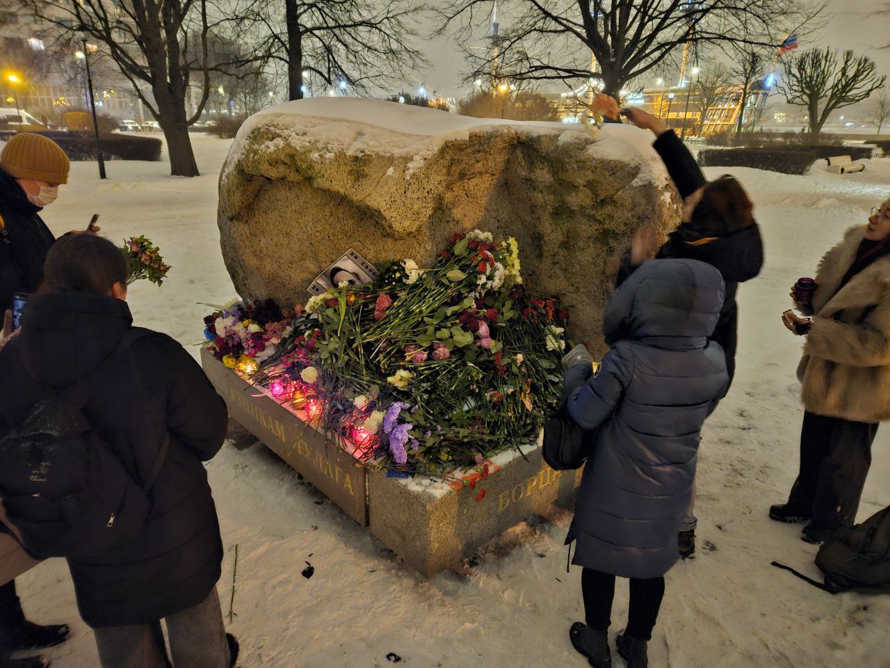 У памятника жертвам политических репрессий на Воскресенской набережной и у Соловецкого камня люди начали возлагать цветы еще днем, через час после сообщения о смерти Навального.