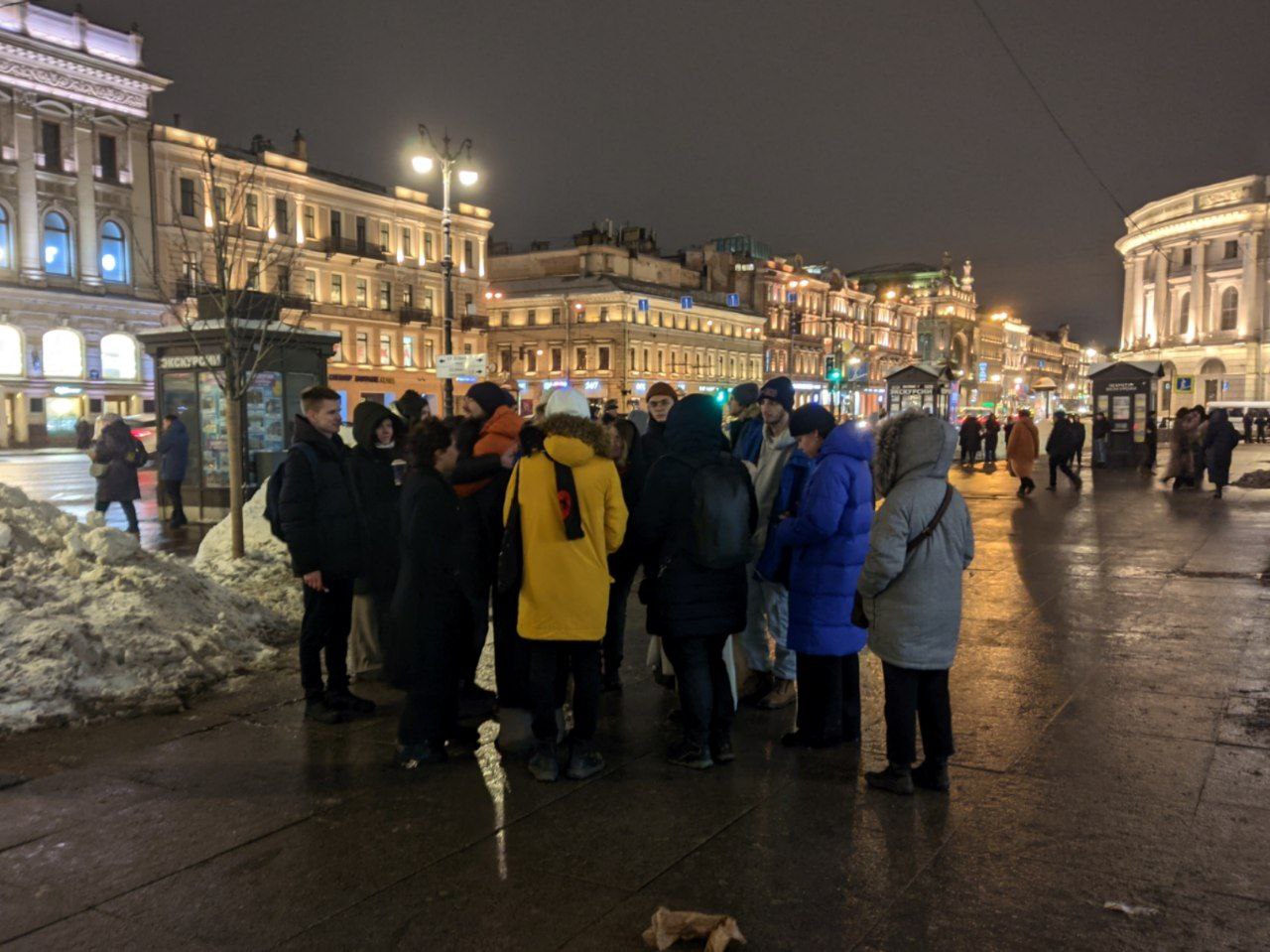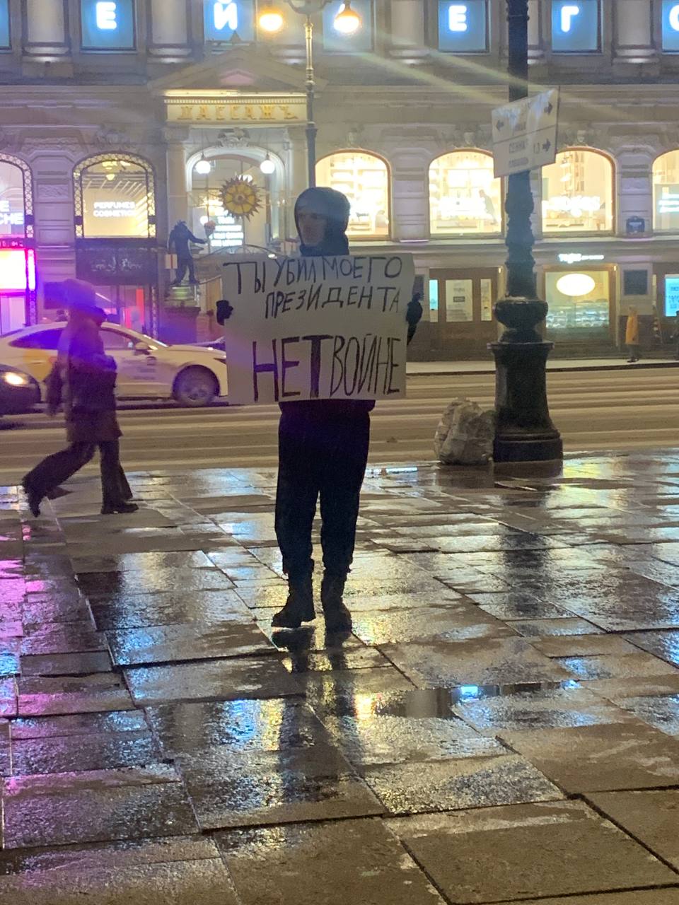К 19:30 люди у Гостиного двора начали расходиться. На место приехал активист Виталий Иоффе. Затем с плакатом вышел другой петербуржец. Его задержали.