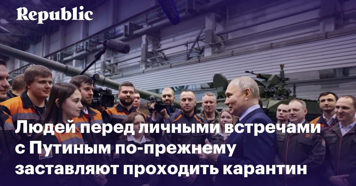 Людям, которым предстоят личные встречи с Владимиром Путиным, по-прежнему приходится проходить карантин. Об этом говорится в репортаже спецкора «Коммерсанта» Андрея Колесникова о визите президента 15 февраля на «Уралвагонзавод» в Нижнем Тагиле, где он пообщался с рабочими. Те сотрудники, кого не отправляли на изоляцию, выполняли роль статистов. С весны 2020 года, когда в мире началась пандемия коронавируса, Кремль ввел обязательный двухнедельный карантин под надзором сотрудников ФСО для тех, кто встречался с Путиным, в последнее время, как сообщали СМИ, его сократили до пяти дней.