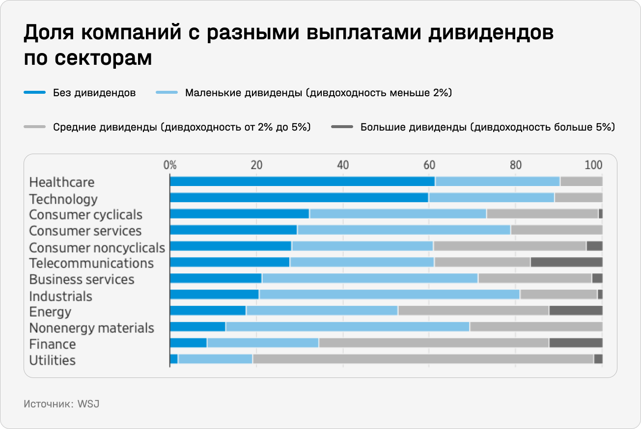 Большинство компаний в быстрорастущих отраслях, прежде всего в секторах здравоохранения и IT, с 2008 года не платили дивиденды. Сейчас около 70% компаний в индексе S&P 500 выплачивают дивиденды, но достаточно скромные — в среднем на уровне 2%. Дивиденды платят компании из устоявшихся секторов, таких как финансы и коммунальное хозяйство. В высокотехнологичном Nasdaq дивиденды платят только 40% компаний.