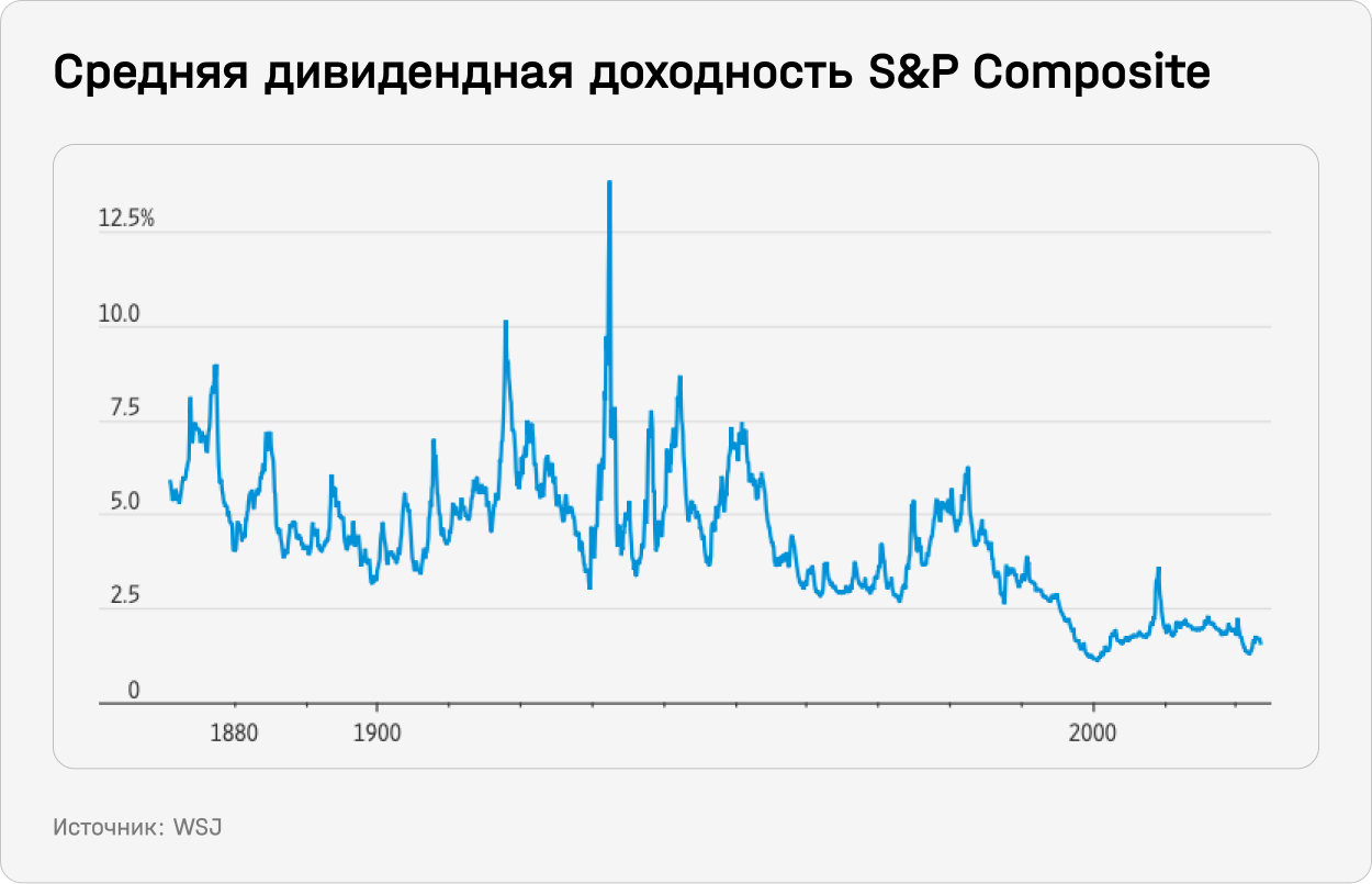 Ближе к концу века под влиянием снижающихся ставок значимость регулярных денежных выплат акционерам начала снижаться: дивиденды постепенно уступали место обратному выкупу акций, которые тоже являются косвенным методом распределения денег между акционерами. В последние два десятилетия прошлого века средняя дивидендная доходность на американском рынке резко снизилась, подсчитал Шиллер.