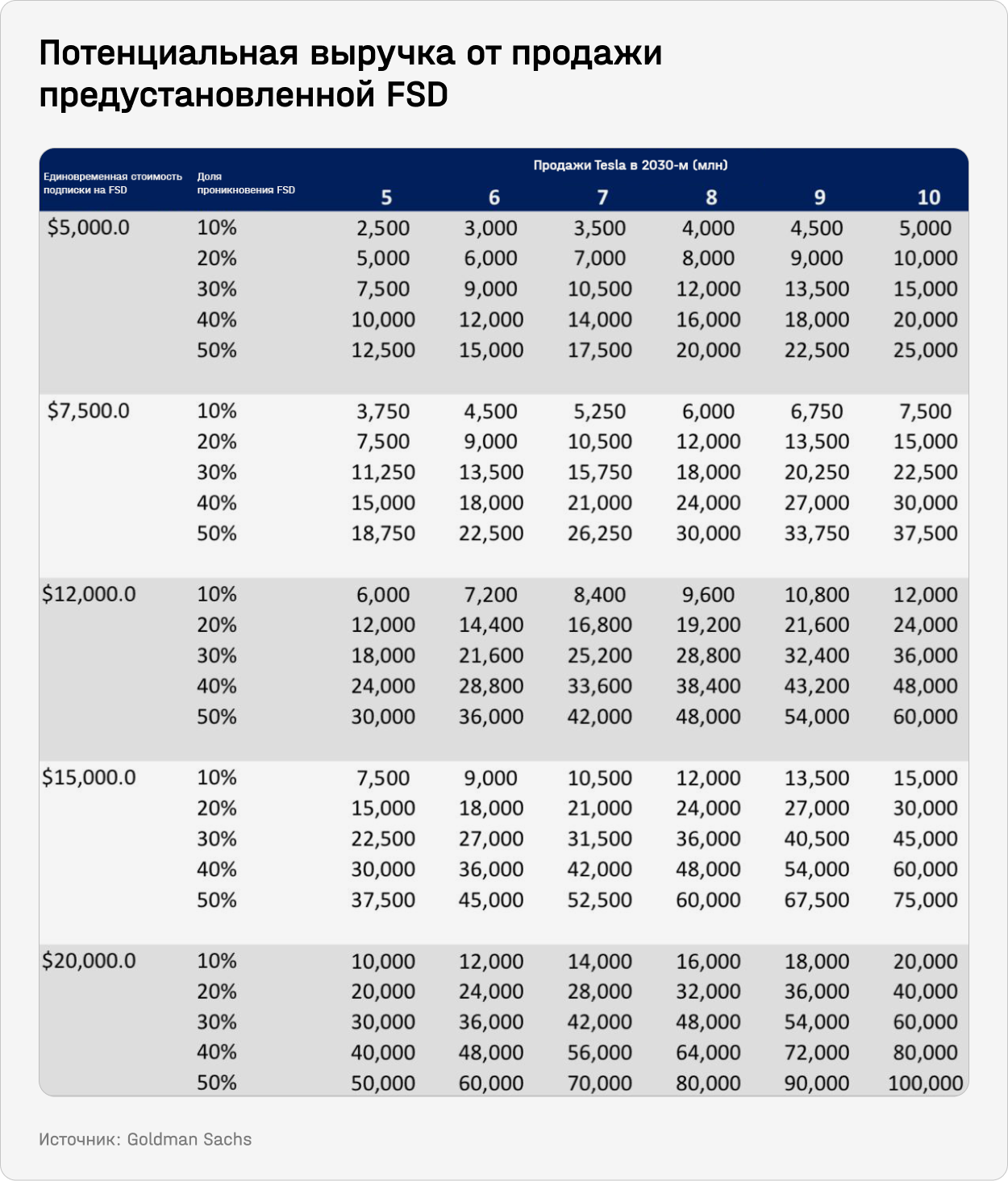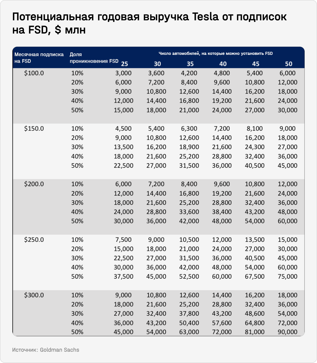 Выручка от FSD, установленных на самих Tesla, сильно зависит от количества проданных авто. Компания может зарабатывать как на продаже месячных подписок, так за счет уплаты клиентом полной стоимости при продаже — но, очевидно, это будет микс обоих вариантов.