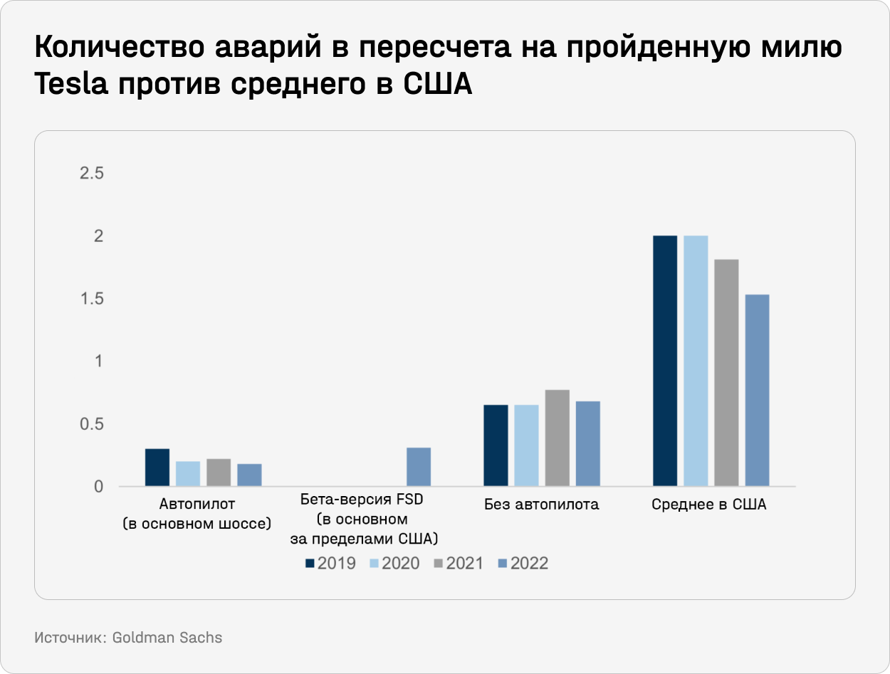 Согласно отчетам Tesla о безопасности и презентациям для инвесторов, и у стандартной технологии автопилота (ADAS), и у более продвинутой FSD количество аварий на пройденную милю меньше, чем у автомобилей, управляемых водителями. По последним данным, количество миль на одну аварию у Tesla с функцией автопилота значительно выше, чем без нее или по сравнению со средним показателем в США.