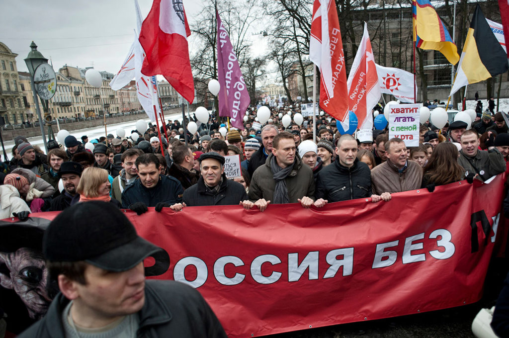 Акции протеста продолжались много месяцев. Алексей Навальный стал одним из лидеров оппозиции и участвовал в митингах в Санкт-Петербурге (слева, 25 февраля 2012 года) и в Москве (справа, 5 марта 2012 года). Фото: Finistre Arnaud / ABACA / Shutterstock / Vida Press