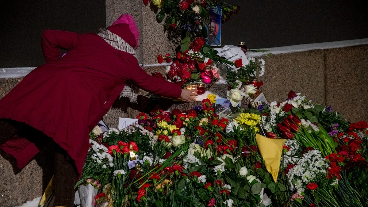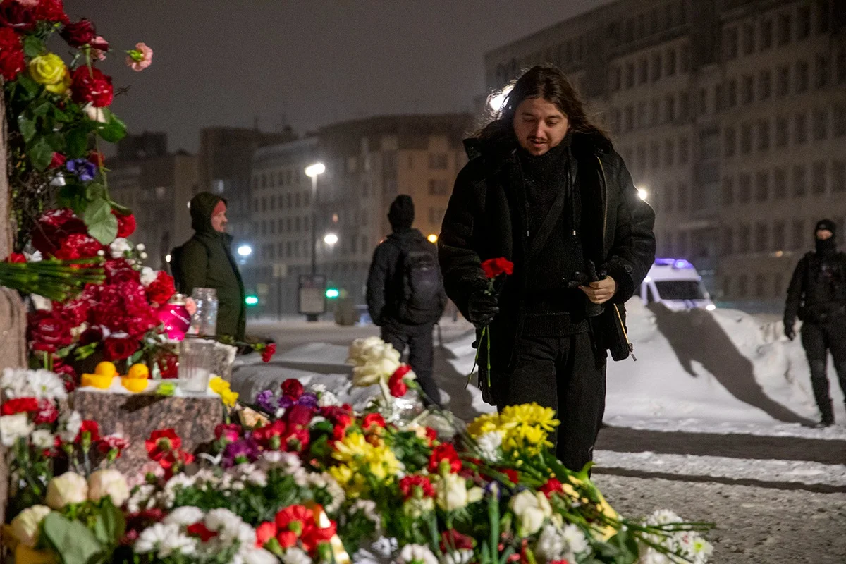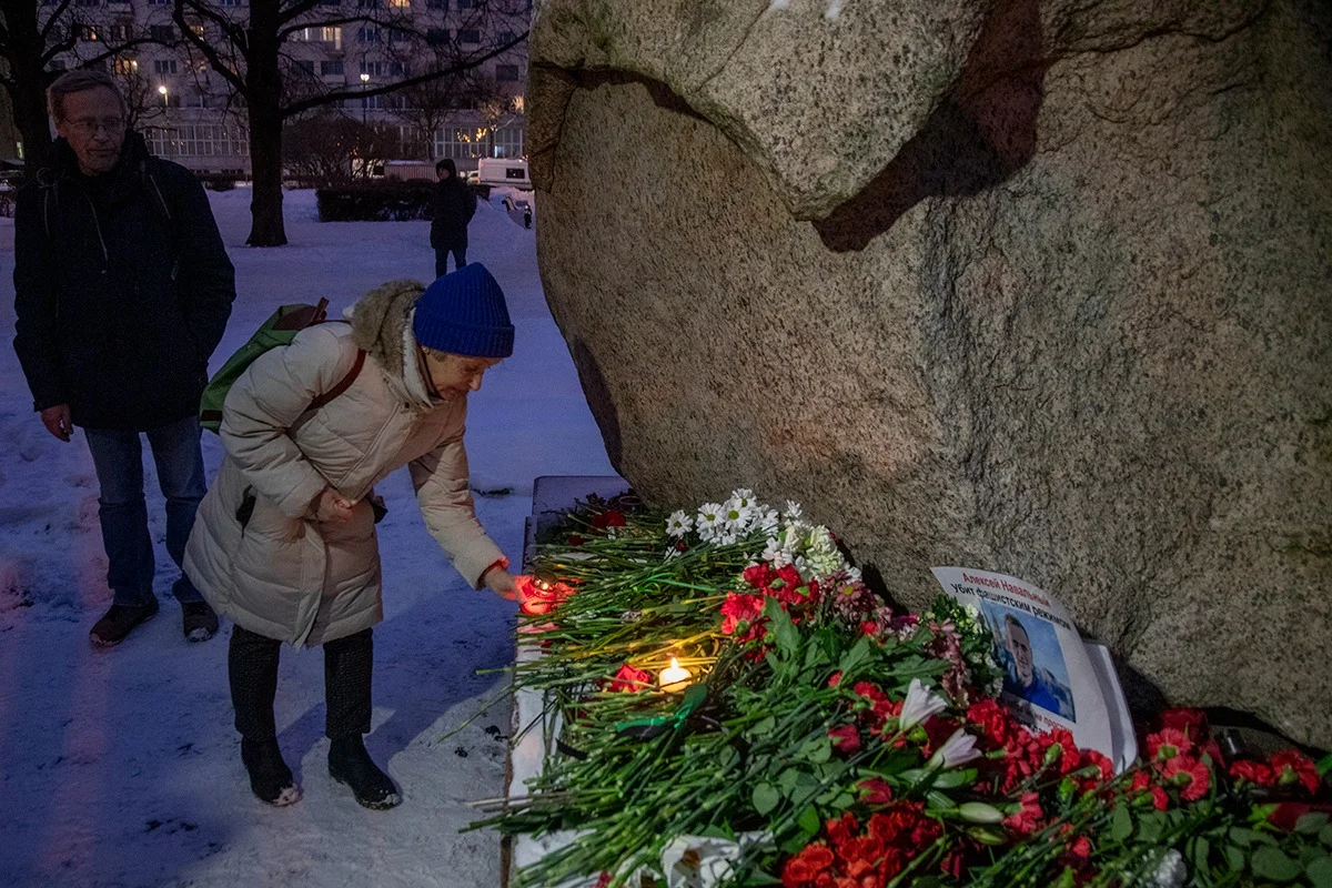 Примерно с 16 часов дня, то есть спустя час после того, как стало известно о смерти Алексея Навального, и до поздней ночи петербуржцы несли цветы, свечи и распечатанные на ксероксе портреты политика к двум городским мемориалам — к Соловецкому камню на Троицкой площади и к памятнику жертвам политических репрессий на Воскресенской набережной.