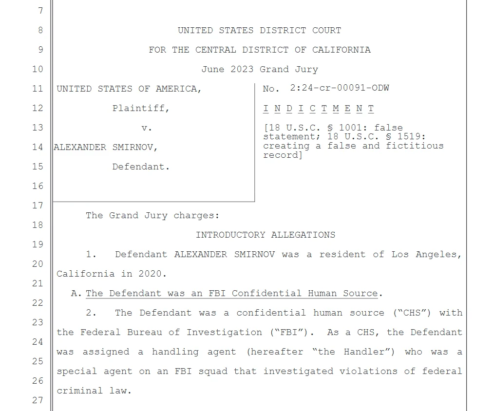 Сенсационные утверждения давнего агента ФБР, чье дело ведет федеральная прокуратура Центрального округа Калифорнии в Лос-Анджелесе, рассекретил летом прошлого года сенатор-республиканец Чак Грэссли. Он опубликовал отчет об агентдонесении Смирнова, что напечатано на стандартной форме FD-1023, датированной 26 и 29 июня 2020 года.