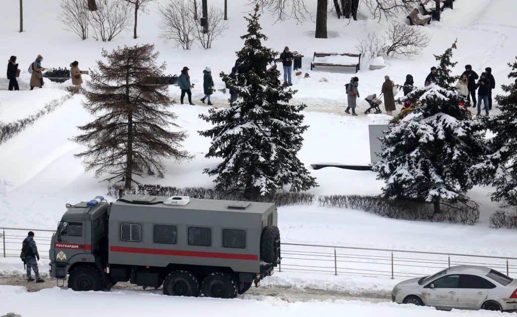 Люди несут цветы к Соловецкому камню на Лубянской площади в Москве, 17 февраля 2024 года. Фото: Contributor / Getty Images