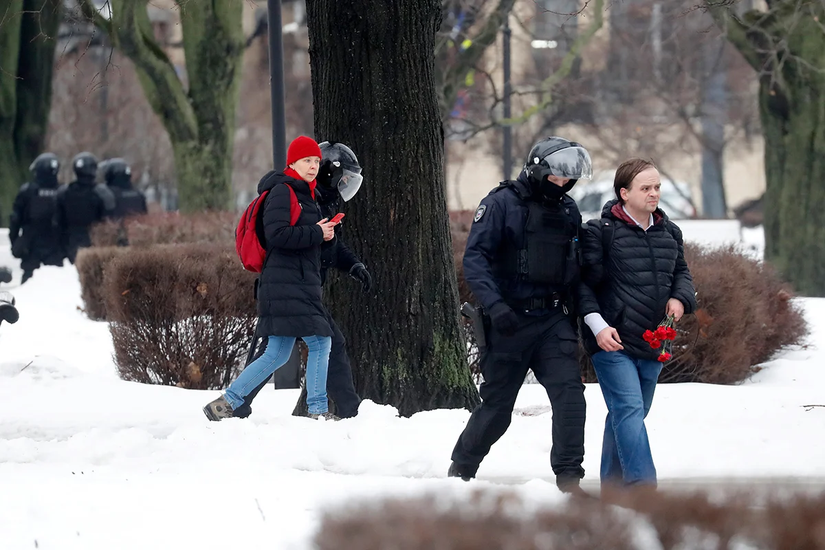 Сотрудники полиции задерживают участников гражданской панихиды по Алексею Навальному у мемориала политзаключенным в Санкт-Петербурге, 17 февраля 2024 года. Фото: Анатолий Мальцев / EPA-EFE