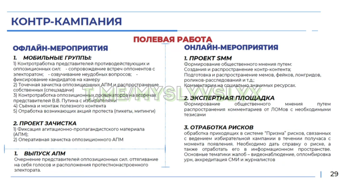 Отдельно упомянуты действия в рамках «контр-кампании». В частности, предусмотрены «оперативная зачистка оппозиционного агитационно-пропагандистского материала», «очернение представителей оппозиционных сил», «подготовка и распространение мемов, фейков, лонгридов, роликов-расследований и т. д.».