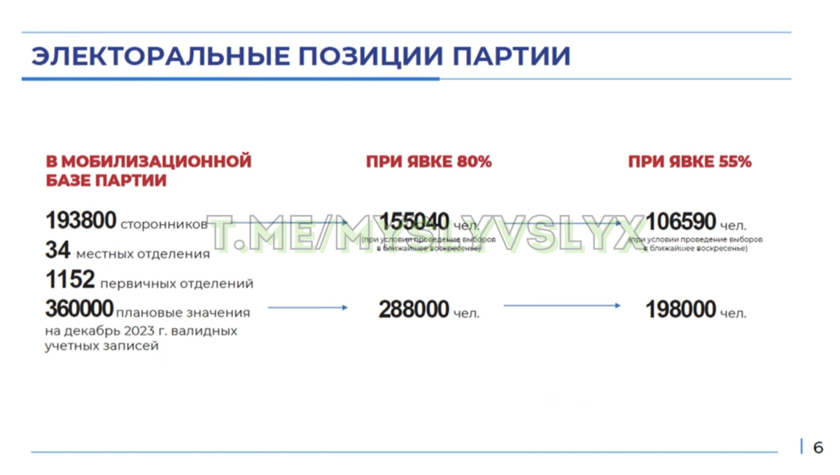 В документе говорится о «мобилизационной базе партии». На момент написания стратегии она составляла 193,8 тыс. сторонников, плановый показатель на декабрь прошлого года — 360 тыс. При явке 55% по «партийной мобилизации» на выборы должны прийти 198 тыс. человек из «базы», при явке 80% — 288 тыс. Дополнительно планируется «мобилизация» сотрудников в здравоохранении, образовании, промышленности, а также молодежи.