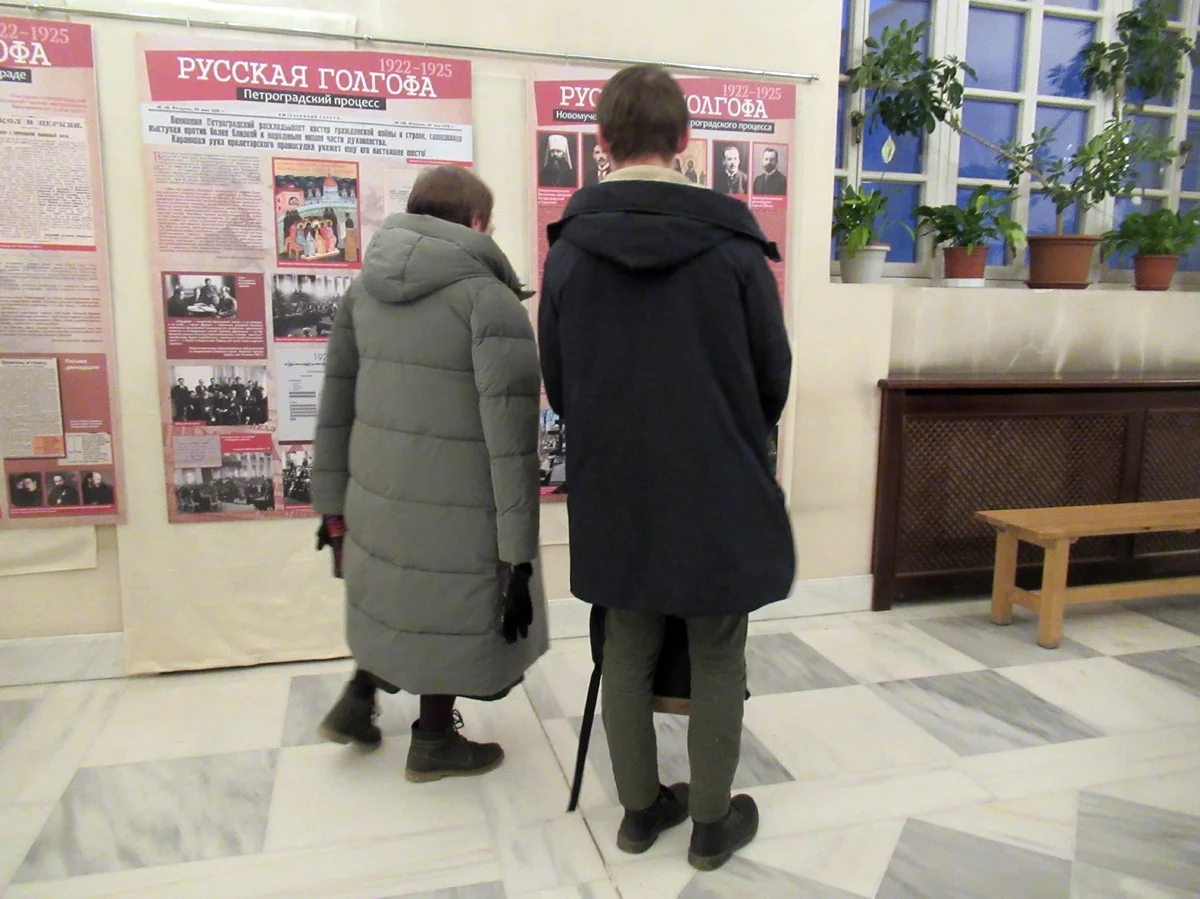 На стенде, посвященном печально знаменитому Петроградскому церковному процессу, происходившему летом 1922 года, представлены копии фотографий, выполненных Виктором Буллой, факсимиле документов. Среди них впервые опубликованный специальный билет для входа в судебный зал, факсимильная копия послания митрополита Вениамина (Казанского), расстрелянного по приговору этого суда.